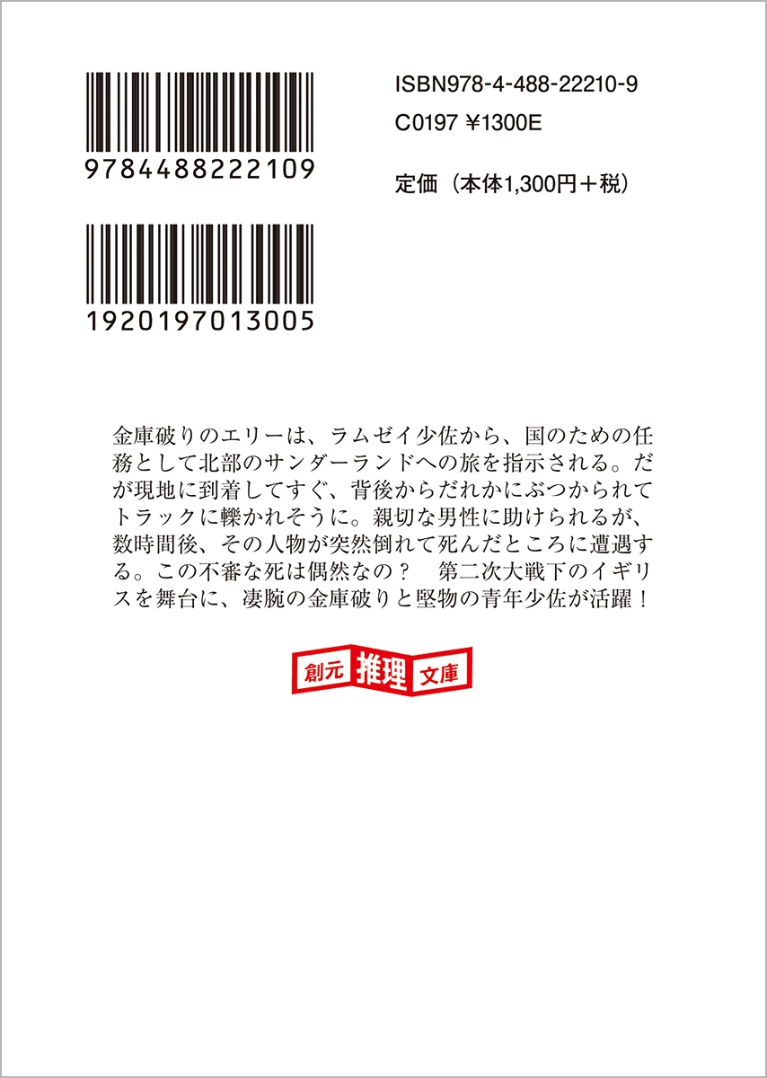 | 殺人事件の捜査も恋の行方も謎だらけ! 凄腕の金庫破り×堅物の青年少佐 『金庫破りときどきスパイ』シリーズ最新刊 金庫破りのエリーは、ラムゼイ少佐から、国のための任務として北部のサンダーランドへの旅を指示される。だが現地に到着してすぐ、背後からだれかにぶつかられてトラックに轢かれそうに。親切な男性に助けられるが、数時間後、その人物が突然倒れて死んだところに遭遇する。この不審な死は偶然なの? 第二次大戦下のイギリスを舞台に、凄腕の金庫破りと堅物の青年少佐が活躍!解説=柿沼瑛子 |
