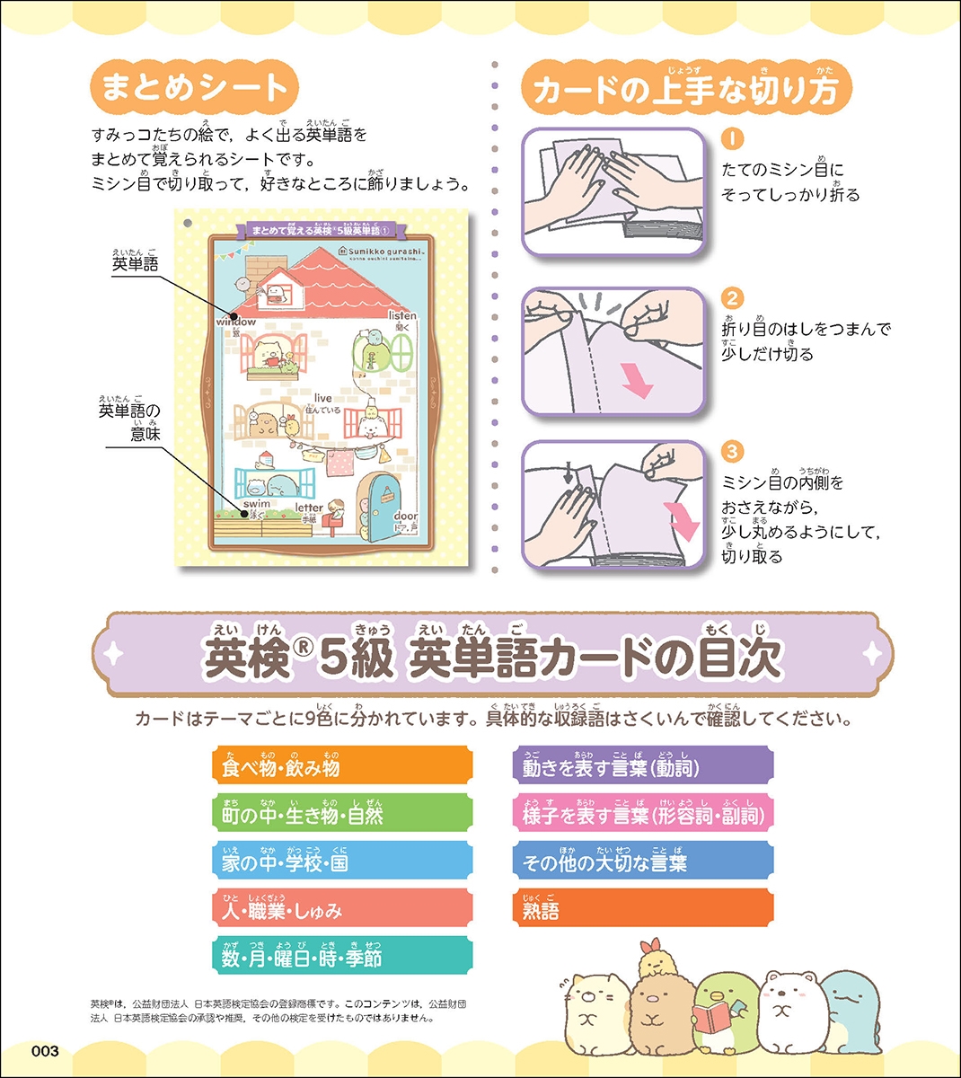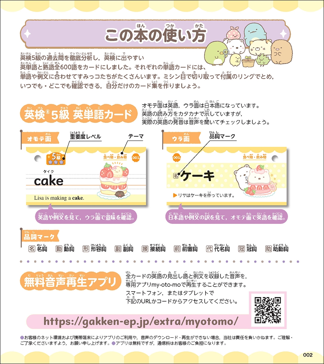| はじめての英検は すみっコぐらしと一緒に 楽しく始めよう! ★ すみっコぐらしのアートがたっぷりの、英検5級合格に必要な英単語カード600枚。 ★ 4このリングと2種類のかわいい表紙カード付きでオリジナル単語帳が作れる。 ★ カタカナによる読みがな付き、4線付き、全単語に音声付きで、はじめてでも安心。 ★ すみっコたちの絵でまとめて頻出単語などを覚えられるまとめシート8種類付き。 |