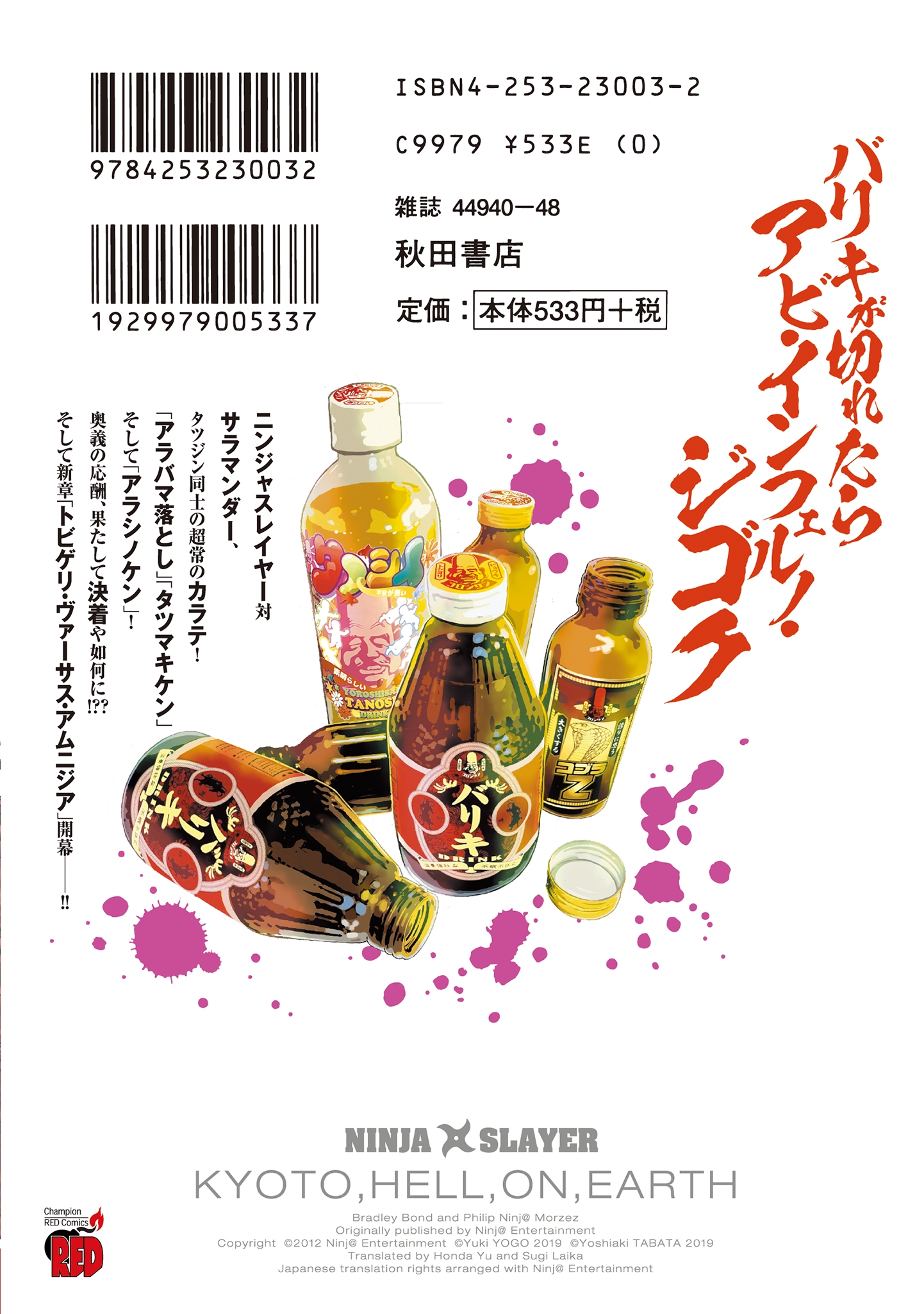 | シャドー・コンのドヒョーにて対峙する二忍、ニンジャスレイヤーとサラマンダー。 ニンジャスレイヤーから放たれる強烈なカラテを絶対防御カラダチにて受けるサラマンダー。 タツジン同士の攻防の中、ニンジャスレイヤーが強力無比なカラテ投げ技「アラバマ落とし」をサラマンダーに見舞った。 だがドヒョーに上がる土煙が晴れるとそこにはドヒョーを拳で殴り、倒立状態でたたずむサラマンダーの姿が!? 危機から反転、攻勢に出たサラマンダーは、ニンジャスレイヤーに先ほど受けた「アラバマ落とし」を仕掛け、 ニンジャスレイヤーがドヒョーに突き刺さる。 その時、記憶を失くし、己が何者か分からずただ観ているだけだったユカノのニューロンが活性化! 記憶が蘇ったユカノの叫びにより、一度はドヒョーに沈んだニンジャスレイヤーも復活! その様を見たサラマンダーは、さらにチャドーの奥義を見せろとニンジャスレイヤーを挑発する。 出るかチャド―奥義アラシノケン!? カラテのタツジン二忍のイクサの行方、果たして――?? |
