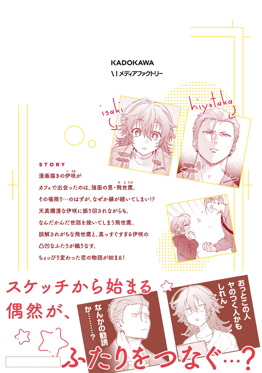| 漫画家志望の伊咲がカフェで出会ったのは、鋭い目つきで誰も寄せつけない強面の男・飛世鷹。 その場限り…だったはずが、なぜか縁が続いて――!? 天真爛漫な伊咲に振り回されながらも、飛世鷹もなんだかんだ世話を焼いてしまい…。 凸凹だけど互いを色づけ合うふたりのちょっぴり変わった恋の物語が始まる! |