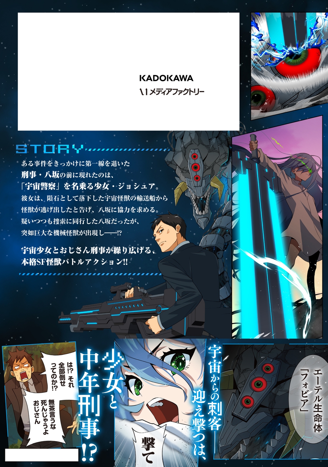 | ある事件をきっかけに第一線を退いた刑事・八坂の前に現れたのは、 「宇宙警察」を名乗る少女・ジョシュア。 彼女は、隕石として落下した宇宙怪獣の輸送船から怪獣が逃げ出したと告げ、 八坂に協力を求める。 疑いつつも捜索に同行した八坂だったが、突如巨大な機械怪獣が出現し――!? 宇宙少女とおじさん刑事が繰り広げる、本格SF怪獣バトルアクション!! |