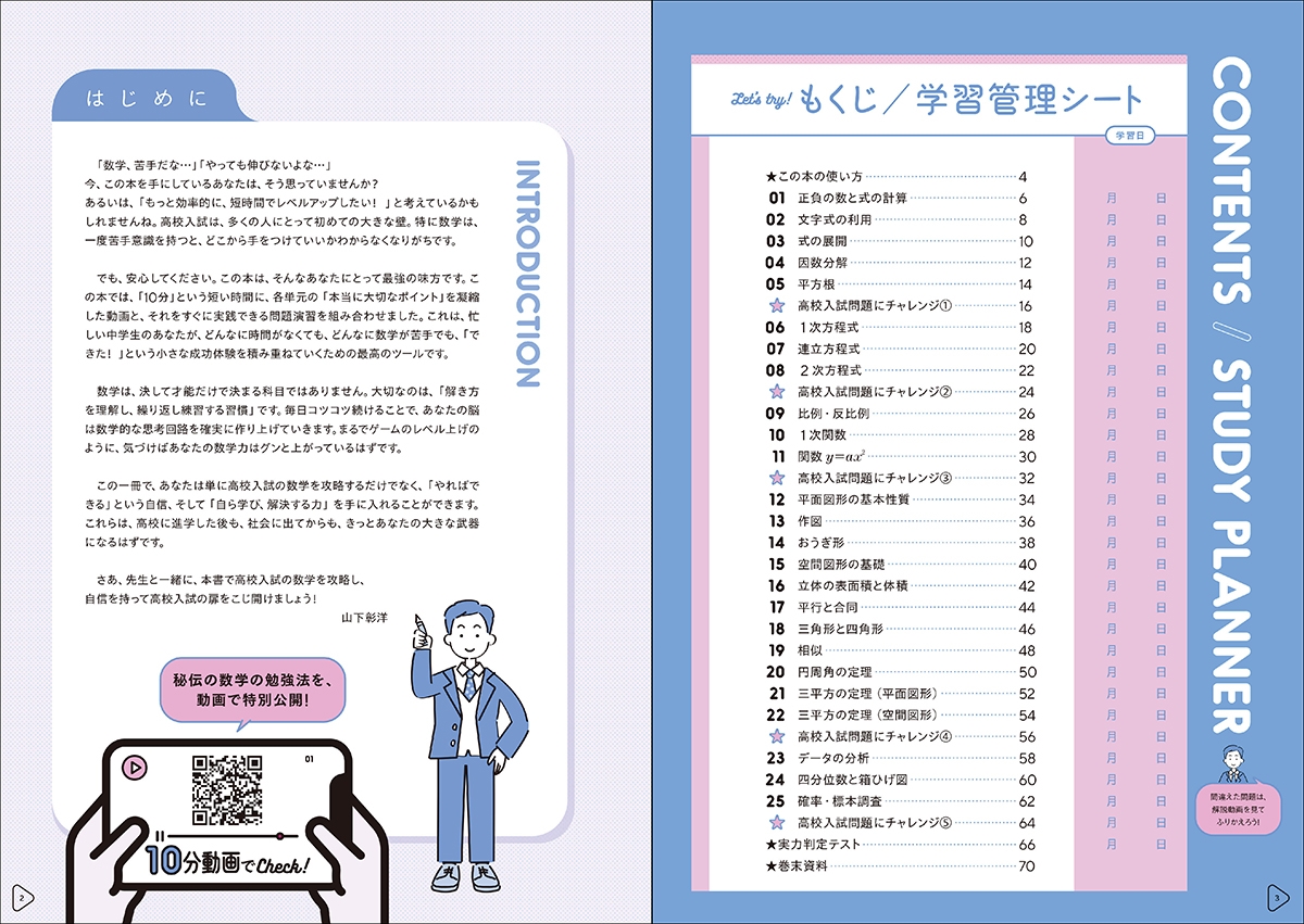 | ★ 1回10分の授業動画が全力バックアップ! 1動画でおさらい(INPUT)→2動画解説付き問題演習(OUTPUT)の2ステップ。 有名講師による丁寧な解説動画付きだから、つまずかない! ★ 中学3年間の総復習が、スピーディ―に1冊で完結! 1回分はたった2ページ、全25回完結! スピーディーに中学3年分の基礎がためができる! ★ 実際の入試問題にチャレンジできる! 「高校入試問題にチャレンジ」全5回、「実力判定テスト」全1回付き。 本番さながらのテストで、力試しができる! |