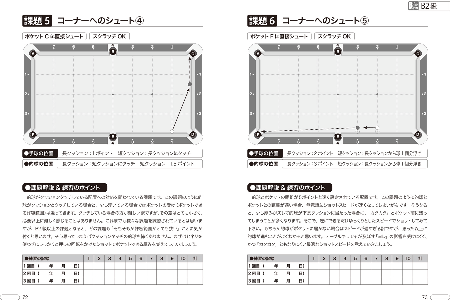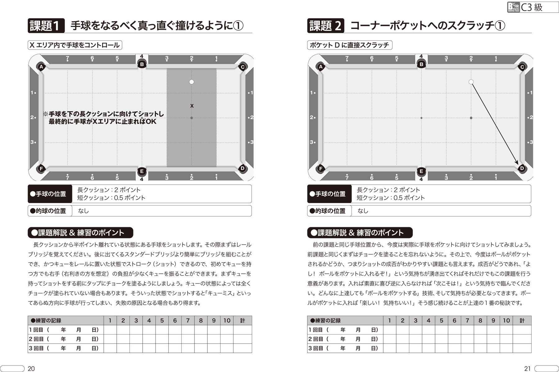 | 究極の「ショット力」徹底強化プログラムで あなたは確実に進化する! ビリヤードは「ショット力」が全て! 厳選された120課題への挑戦であなたのスキルは次の次元へ。 ビリヤードは1人でも楽しく上手くなれる! これから始める人も、ベテランプレイヤーも、上達の早道となるトレーニングブック! 各課題ごとにスキルアップのポイントを検定のエキスパートが詳しく解説。 初心者を導くレッスン書としても最適! ビリヤード検定はJOC加盟のスポーツ団体『(公社)日本ビリヤード協会』が公認するショット力が判定できる唯一の技術検定。 その必修課題は初心者から上級者まで上達したい全てのプレイヤーのバイブルです。 ●ビリヤード検定とは? C3級~S1級までの12のレベルで構成された課題配置を使い、全国規模のテストによってビリヤードの技術レベルを客観的に判断。 現在は全国の開催登録ビリヤード場で年4回開催しています。 CONTENTS ビリヤード検定とは? ビリヤードで効率良く上達するために 本書の基本的な使い方 本書で使用するビリヤード用語について ショットの成否について ○C3級課題(課題1?10) C3級まとめ ○C2級課題(課題1?10) C2級まとめ ○C1級課題(課題1?10) C1級まとめ ○B3級課題(課題1?10) B3級まとめ ○B2級課題(課題1?10) B2級まとめ ○B1級課題(課題1?10) B1級まとめ ○A3級課題(課題1?10) A3級まとめ ○A2級課題(課題1?10) A2級まとめ ○A1級課題(課題1?10) A1級まとめ ●S3級課題(課題1?10) S3級まとめ ●S2級課題(課題1?10) S2級まとめ ●S1級課題(課題1?10) S1級まとめ 付録?課題配置用テンプレート ビリヤード検定の受検について |