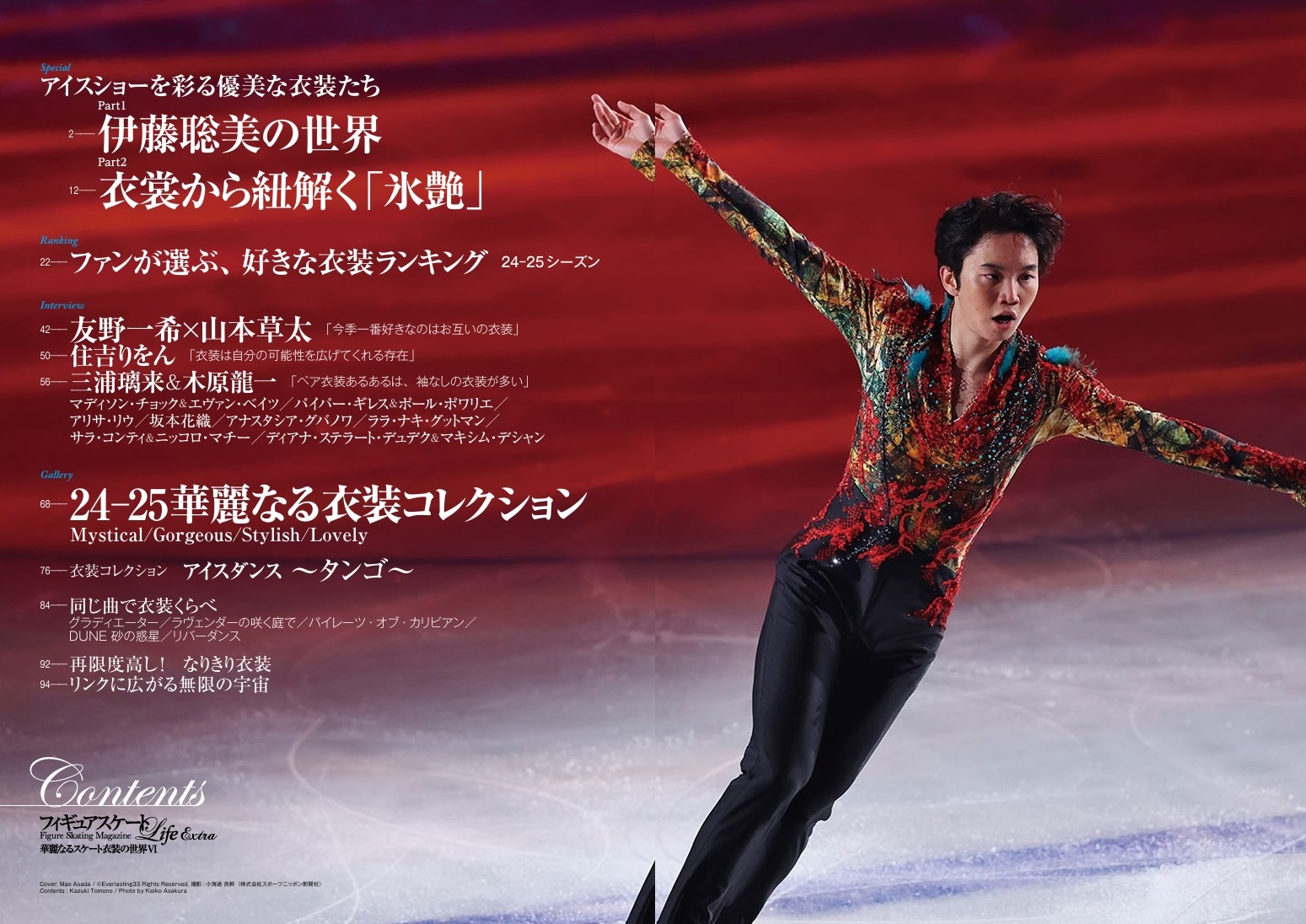 | フィギュアスケートの「衣装」を特集するムックの第6弾は、「アイスショーを彩る優美な衣装たち」を大特集。 Part1は衣装デザイナー「伊藤聡美の世界」。表紙の浅田真央さん「ボレロ」をはじめ、アイスショー「Everlasting33」や「BEYOND」での豪華絢爛な衣装を、制作エピソードやデザイン画とともに紹介。また羽生結弦さんの「Echoes of Life」「notte stellata 2025」で制作した新作衣装についても語っていただきます。 Part2は「衣裳から紐解く『氷艶』」。高橋大輔さんと増田貴久さんのダブル主演で、7月に新作「鏡紋の夜叉」の公演を控える「氷艶hyoen 2025」。衣裳を担当するアトリエ88%の三浦洋子さんに、各キャラクターの衣裳について詳細にお聞きしました。初披露のデザイン画とともに「氷艶2025」の世界観を一早く味わえます。 「スケート衣装対談」は、今シーズンの衣装を中心に、友野一希選手と山本草太選手がお互いの衣装や気になった選手の競技衣装について語り合います。 三浦璃来&木原龍一選手にはシーズン途中でチェンジした衣装について、「ペア衣装あるある」もお聞きしました。また今季の独創的な衣装が話題の住吉りをん選手に、プログラムと衣装へのこだわりや、お母さまが手作りされた衣装の思い出を語っていただきます。 他にも坂本花織選手、アリサ・リウ選手、マディソン・チョック選手、ギレス&ポワリエ選手など衣装が素敵な選手たちにお気に入りポイントやこだわりを伺いました。 毎年恒例、X(ツイッター)で募集した24-25シーズン「衣装人気投票」ランキングを発表! またランキングでは紹介できなかった個性的な衣装の数々も、「衣装コレクション」ギャラリーや「同曲衣装」特集などでご紹介します。 プログラムの世界観を表現する「装置」であり、スケーターの演技を引き立てる「衣装」。眺めるだけでも楽しい一冊ですが、スケーターやデザイナーが衣装について語るインタビューは普段聞けない貴重なエピソードが満載です。 |