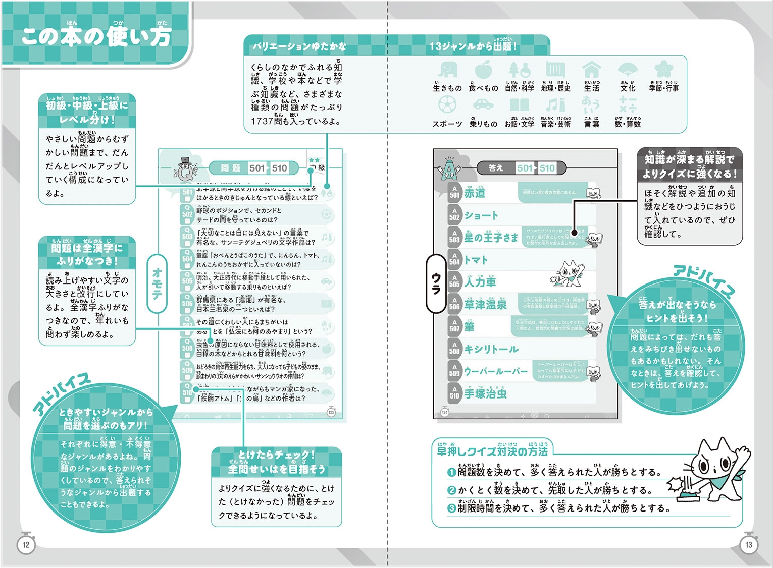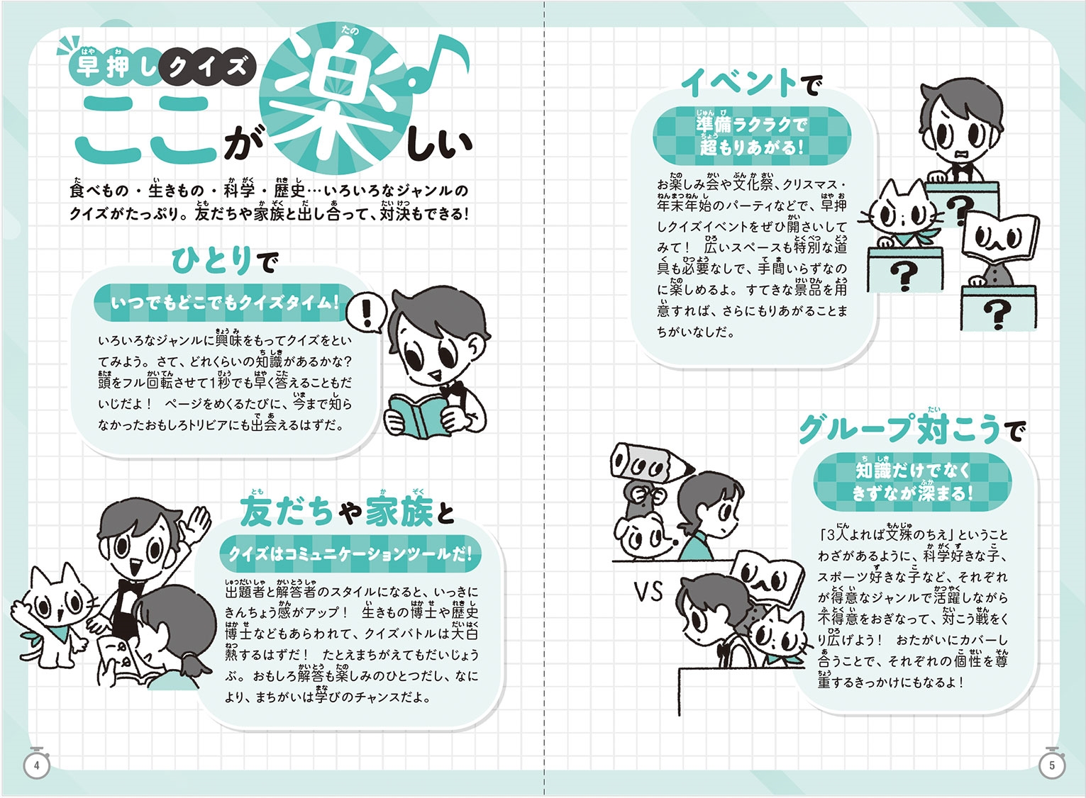 | _______________ 友だちと! 家族と! 知的バトルで盛り上がろう! ________________ 子どもたちが大好きな「早押しクイズ」用の問題集。 小学生なら知っておきたい知識問題から、生きもの、食べもの、科学、歴史、文化、芸術などの教養問題、雑学問題まで、た~っぷり掲載しています。ひとりでといて知力をアップするもよし、お友だちと瞬発力勝負で盛り上がるのもよし、家族のコミュニケーションツールとして楽しむのもよし、絶対に楽しめる一冊です♪ ★いいこといっぱい!★ ・集中力と瞬発力を鍛えらえる! ・知識の確認と吸収ができる! ・脳が活性化する! ・コミュニケーション力の向上! |