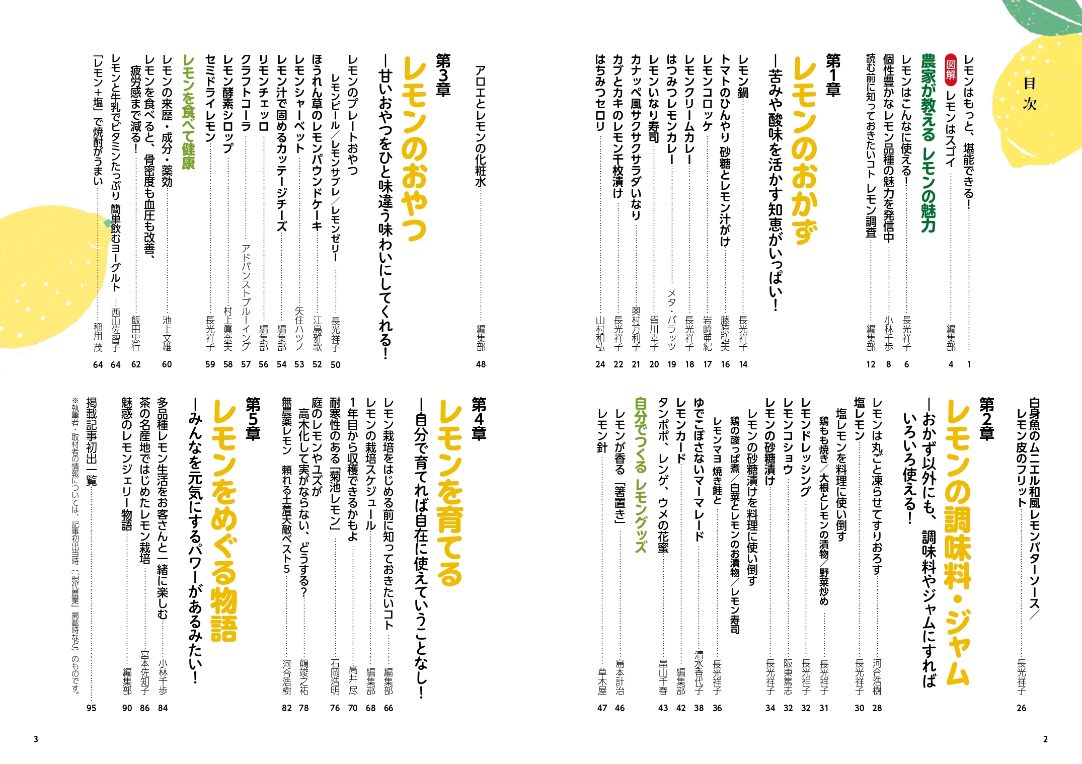 | レモンはもっと、堪能できる!農家、料理家、研究者から教えてもらった、レモン愛にあふれる記事を集めました。定番の塩レモンや砂糖漬けを活用したレシピから、レモンカレー・レモンコロッケなどのおかず、レモンコショウやジャム、枝や葉を使うグッズのつくり方、レモンシャーベットやレモンサブレなどのスイーツ、リモチェッロやレモン酵素シロップなどのドリンク、レモンの基本的な生態や栽培方法、個性豊かなレモン品種の紹介、寒い地域で育てるコツ、小さな木に仕立てる方法、無農薬で害虫退治する方法、各地で起きたレモンをめぐる物語など、レモンづくしの内容。 |