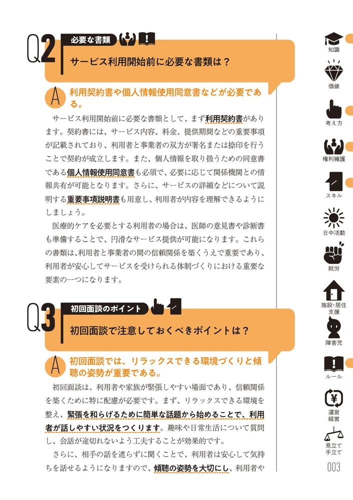 | サービス管理責任者・児童発達支援管理責任者の実務にまつわる、今さら聞けない疑問から最新の内容までを簡潔なQ&Aで展開。「実務編」「事務編」「運営・管理・報酬編」「人材育成編」「地域連携・地域づくり編」「その他」の6章構成で疑問をスッキリ解消! |