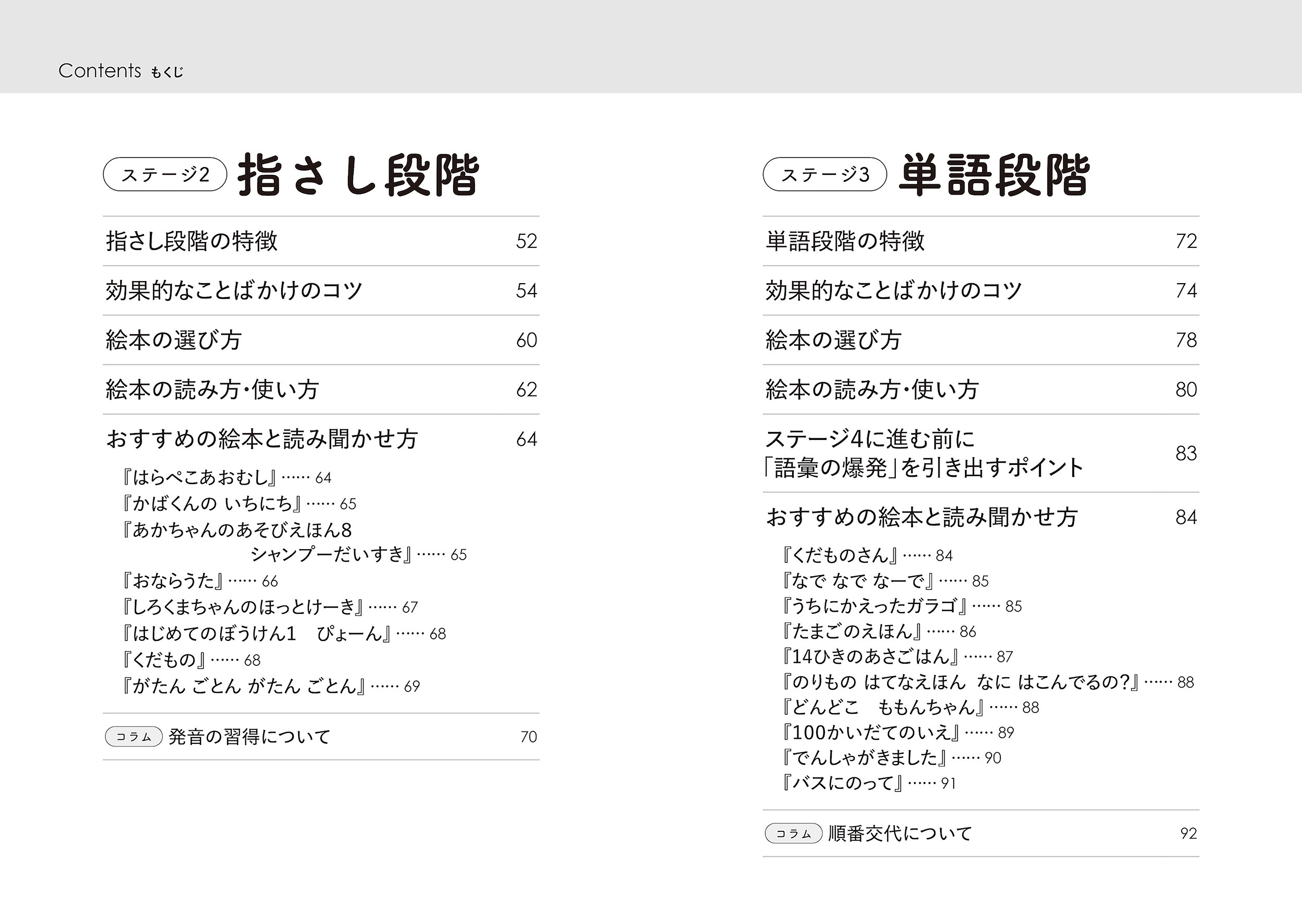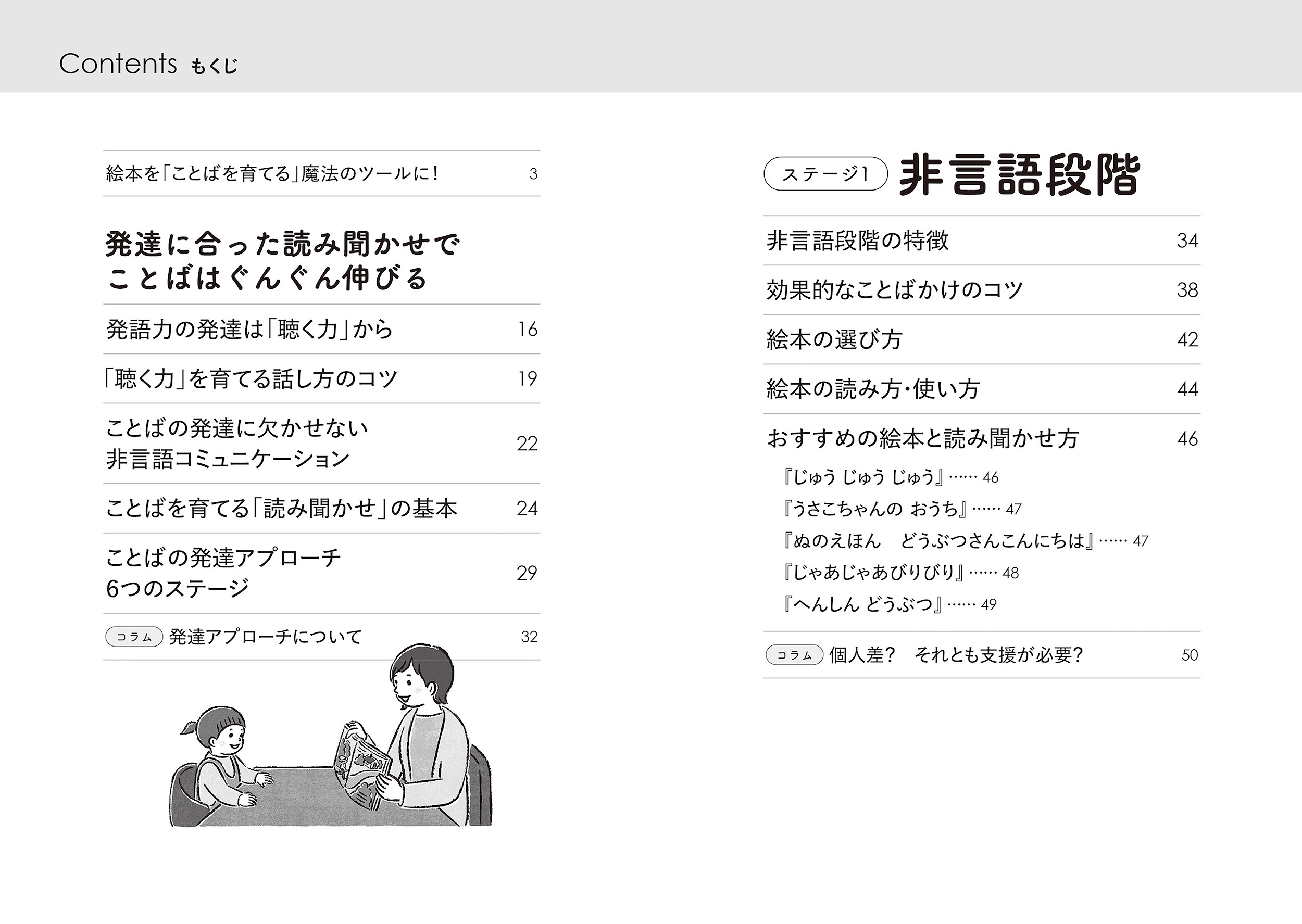 | 【絵本を「ことばを育てる」魔法のツールに!】 お子さんに毎日絵本を読み聞かせているのに、 ことばが増えた感じがしない、内容が伝わっているのかわからない、反応が薄い…。 そんなモヤモヤを感じていたら、 絵本の「読み方」を少し変えてみませんか? 本書は、ことばの6ステージごとの「発達アプローチ」に基づき お子さんの発達ステージに合った絵本の選び方と読み方をご紹介。 各発達ステージごとに、おすすめ絵本ガイドや、効果的なことばかけのコツもお伝えします。 ・ ★ステージ1 非言語段階 自分の要求を伝えることができず、ジェスチャーや表情なども ほとんど使いません。 ・ ★ステージ2 指さし段階 ことばはまだ出ませんが、ジェスチャーで気持ちを伝えたり、 声や指示に反応したりする力が育っています。 指さしや母語に近い発音も始まり、ことばの土台が作られます。 ・ ★ステージ3 単語段階 身近な食べ物の名前などからことばが出始め、 名詞で要求を伝えるようになります。 「バイバイ」などあいさつのことばも徐々に出て、そのあとに動詞も出始めます。 ・ ★ステージ4 二語文段階 「おやつ 食べる」などの二語文を話します。要求を伝える以外にも、質問に答えたり、「大きいワンちゃん」など情報共有のコメントもします。 会話のキャッチボールができるようになってきます。 ・ ★ステージ5 文法段階 「今日の給食は、うどんだった」など「てにをは」で単語をつなげた三語文以上が出て、表現が広がります。 文法を一気に覚え、質問や理由を述べたり、思い出や、予定について話したりできるようになります。 ・ ★ステージ6 会話段階 話題に沿った会話ができ、あいづちを打つ、交互に話すなど会話のマナーが身につきます。日常的な会話には困らなくなっても、知らない人との社交や議論などを行うには、さまざまな会話のルールを学ぶ必要があります。会話スキルを磨くのが、ステージ6の段階です。 ・ 発語から、文法、推論、感情理解まで、 お子さんの語彙を広げ、 思考力とコミュニケーション力が高まるメソッドです! |