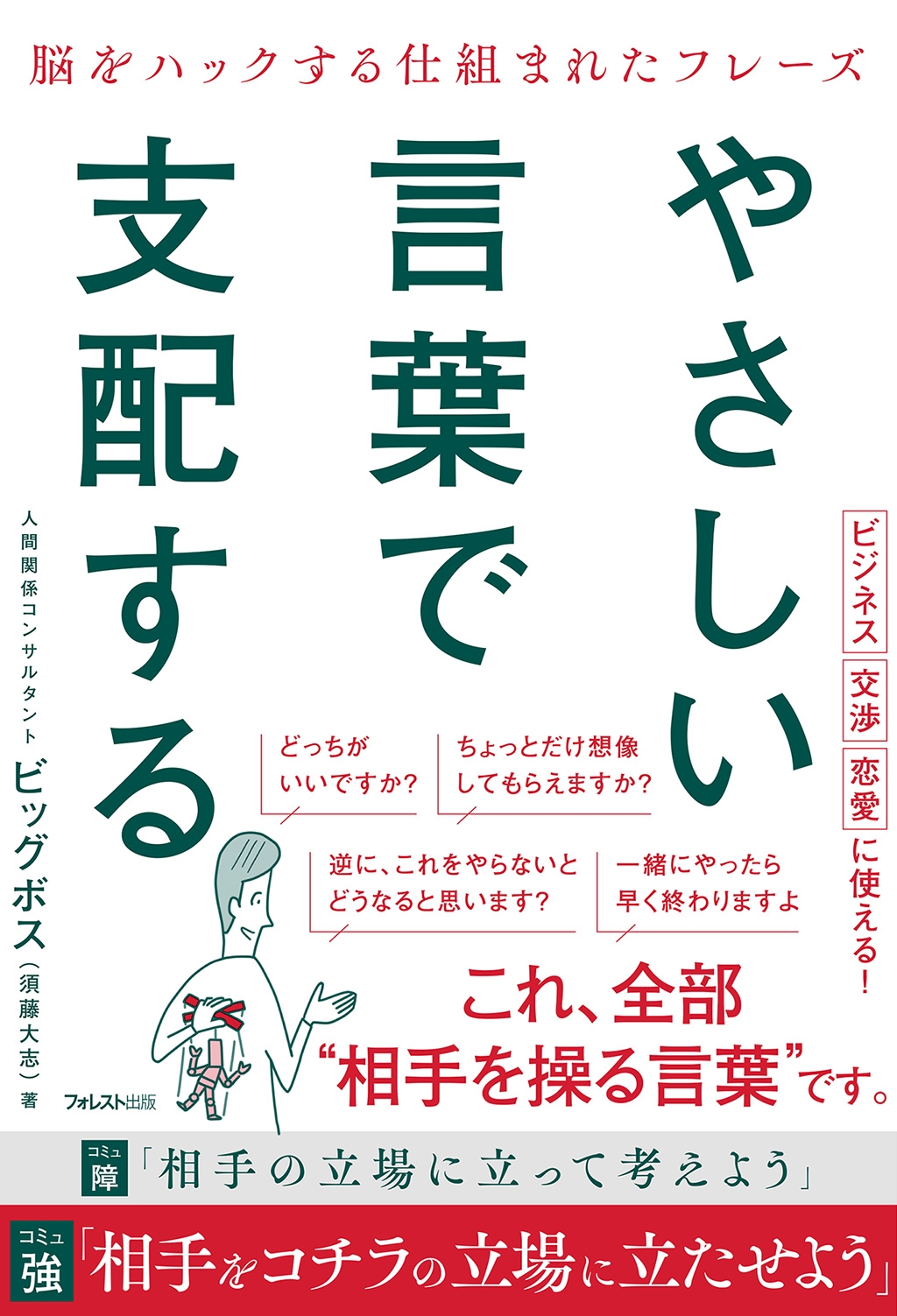 | ◆ビジネス・交渉・恋愛に使える!まったく新しいコミュニケーション術の本が誕生! 口先一つで立場を逆転させる裏コミュニケーション。 ★従来の手法?相手の立場になって考えよう! ★本書の手法?相手を自分の立場(土俵)に立たせよう ■これ全部、主導権を握るために"仕組まれた言葉"です。 「どっちがいいですか?」 「ちょっとだけ想像してもらえますか?」 「逆に、これをやらないとどうなると思います?」 「一緒にやったら早く終わりますよ」 ■「相手は感情で動くタイプか? それとも論理で動くタイプか?」を見極めたうえで、 「この人には理性を刺激するフレーズ」 「この人には感情を刺激するフレーズ」といった形で、フレーズに工夫をこらします。フレーズ例は80以上! ■もくじ 序章 相手の思考の土俵を変えろ 第1章 理性脳をハック!YESを引き出すフレーズ 第2章 感情で殴る!YESを引き出すフレーズ 第3章 意のままに操り、主導権を握る質問フレーズ 第4章 ウザくないZ世代特化フレーズ |