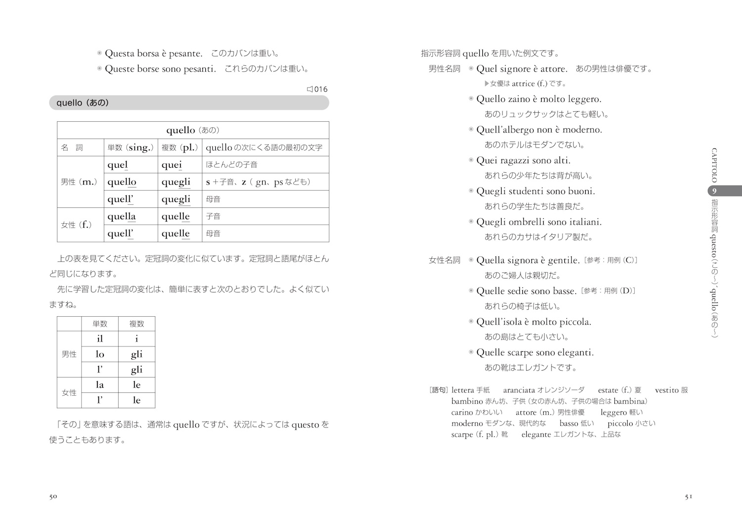 | イタリア語初級者に向けた「丁寧」で「わかりやすい」基本文法解説で、2016年の発売以来、多くの学習者から支持されてきたロングセラーを、音声ダウンロード版にアップデートしました。 一般的な初級文法書とは異なり、ビジュアル的な要素はほどほどに、文法項目をできるだけわかりやすく一冊の読み物のように解説していくので、丁寧に読み進めていけば、途中でつまずいたり必要な知識を取りこぼしたりすることなく、納得しながら着実に文法の体系的な知識を身につけることができます。項目ごとに付いている豊富な練習問題を解くことで、知識をしっかり定着させることもできる、まさに<本気>でイタリア語文法に取り組もうと思っている学習者におすすめの本格的な入門書です。 |