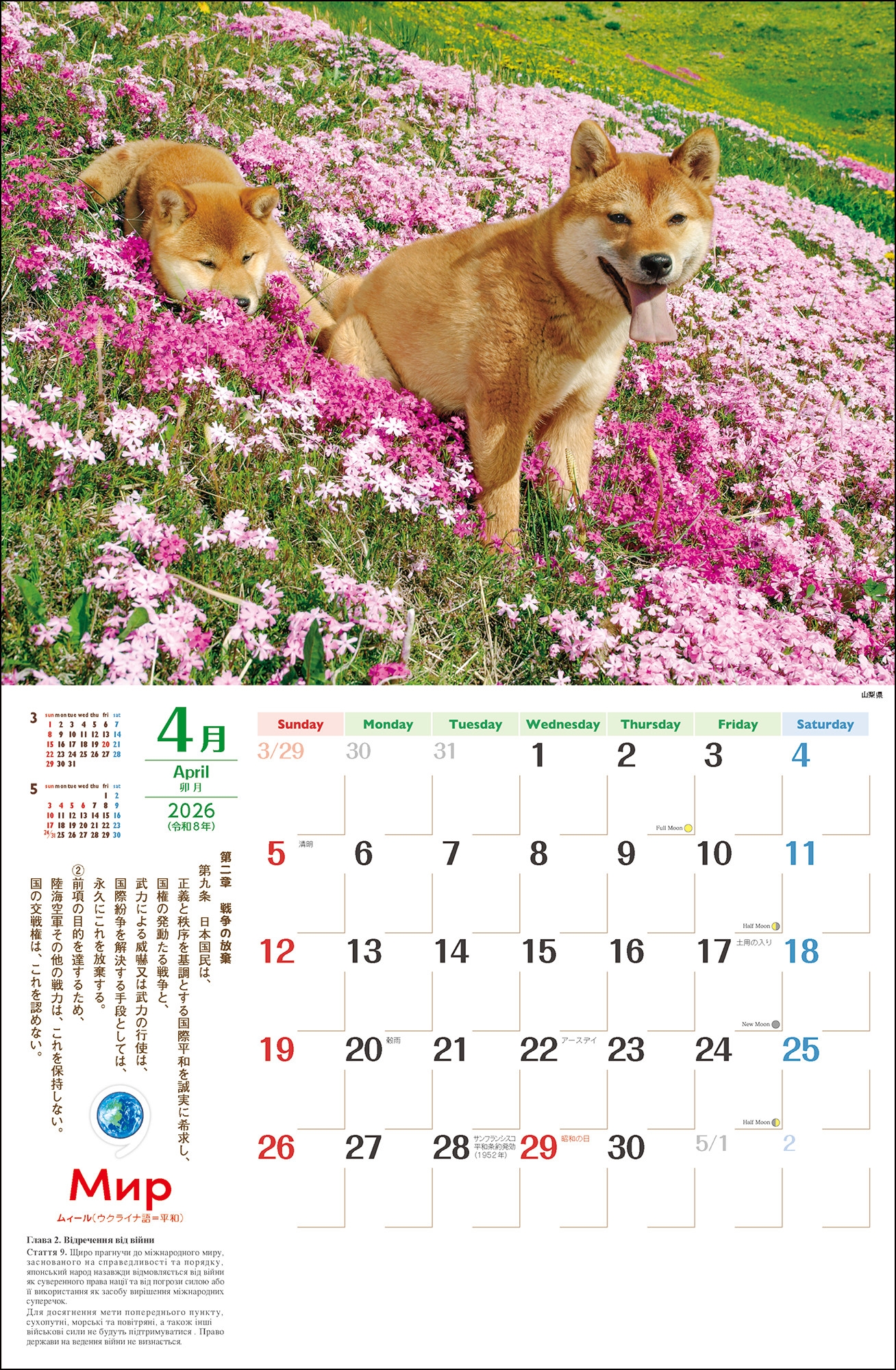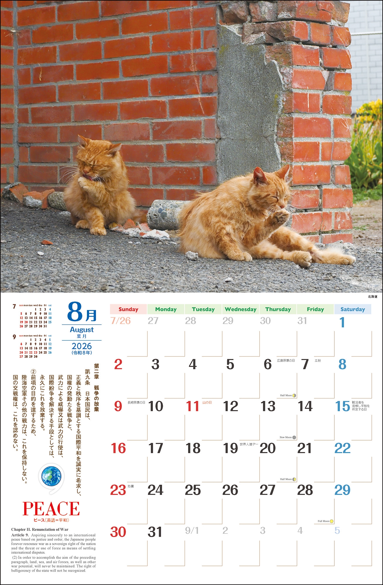 | 2026年版・壁掛カレンダー(月めくり)。岩合光昭撮影の猫や犬と憲法9条の条文を組み合わせたカレンダー |