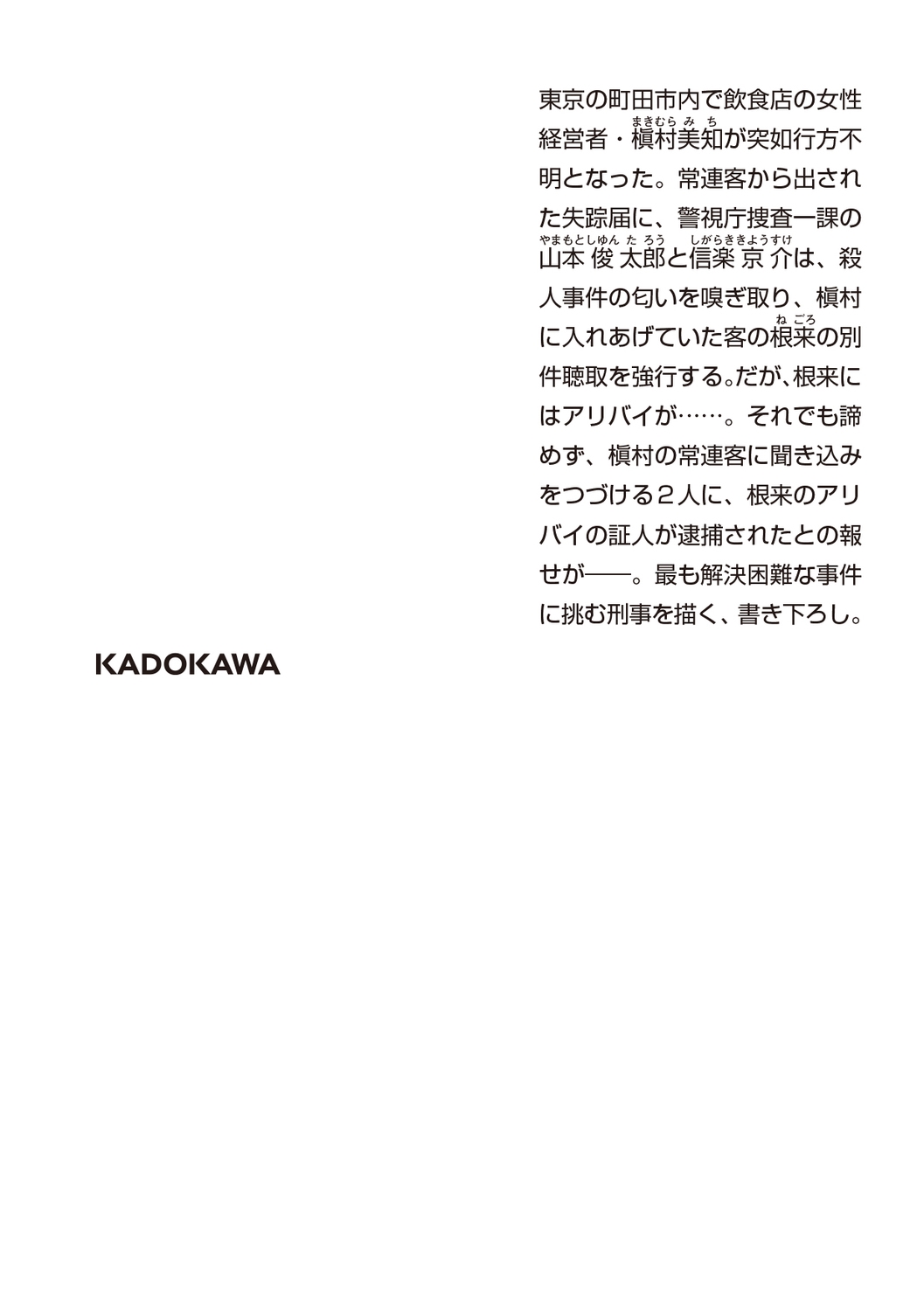 | 東京の町田市内で飲食店の女性経営者が突如行方不明となった。常連客から出された捜索願に、警視庁捜査一課の山本俊太郎と信楽は、殺人事件の匂いを嗅ぎ取る。だが、有力な容疑者には完璧なアリバイが……。 |
