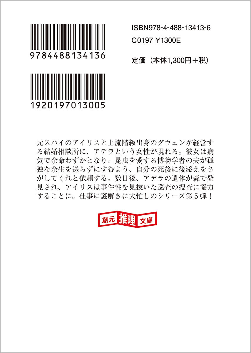 | 結婚相談所なのに、わけありの依頼人ばかり! 元スパイのアイリスと上流階級出身のグウェンは、 仕事&恋愛&事件の謎解きで大忙し! 大人気『ロンドン謎解き結婚相談所』第5弾 元スパイのアイリスと上流階級出身のグウェンが経営する結婚相談所に、アデラという女性が現れる。彼女は病気で余命わずかとなり、昆虫を愛する博物学者の夫が孤独な余生を送らずにすむよう、自分の死後に後添えをさがしてくれと依頼する。数日後、アデラの遺体が森で発見され、アイリスは事件性を見抜いた巡査の捜査に協力することに。仕事に謎解きに大忙しのシリーズ第5弾! 解説=上條ひろみ |