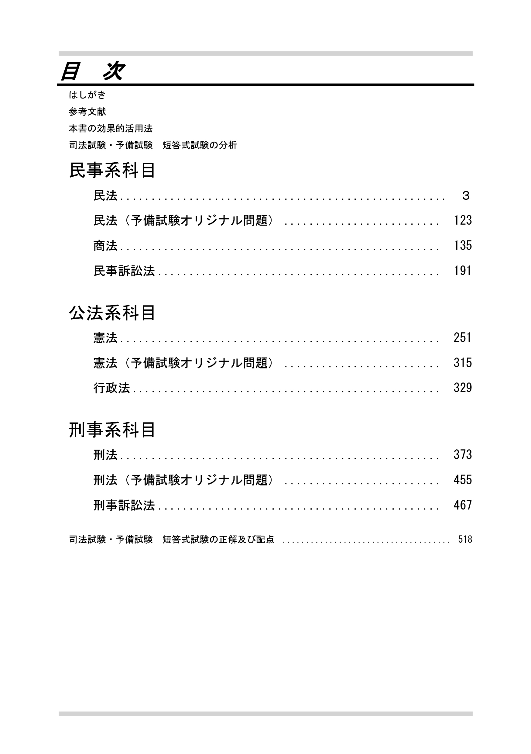 本書では効率的に司法試験および予備試験短答式試験の対策を行うことができるよう、正解を導くために必要十分な情報(条文知識・判例の判示部分・基本的事項の説明等)を過不足なく解説することを徹底しています。