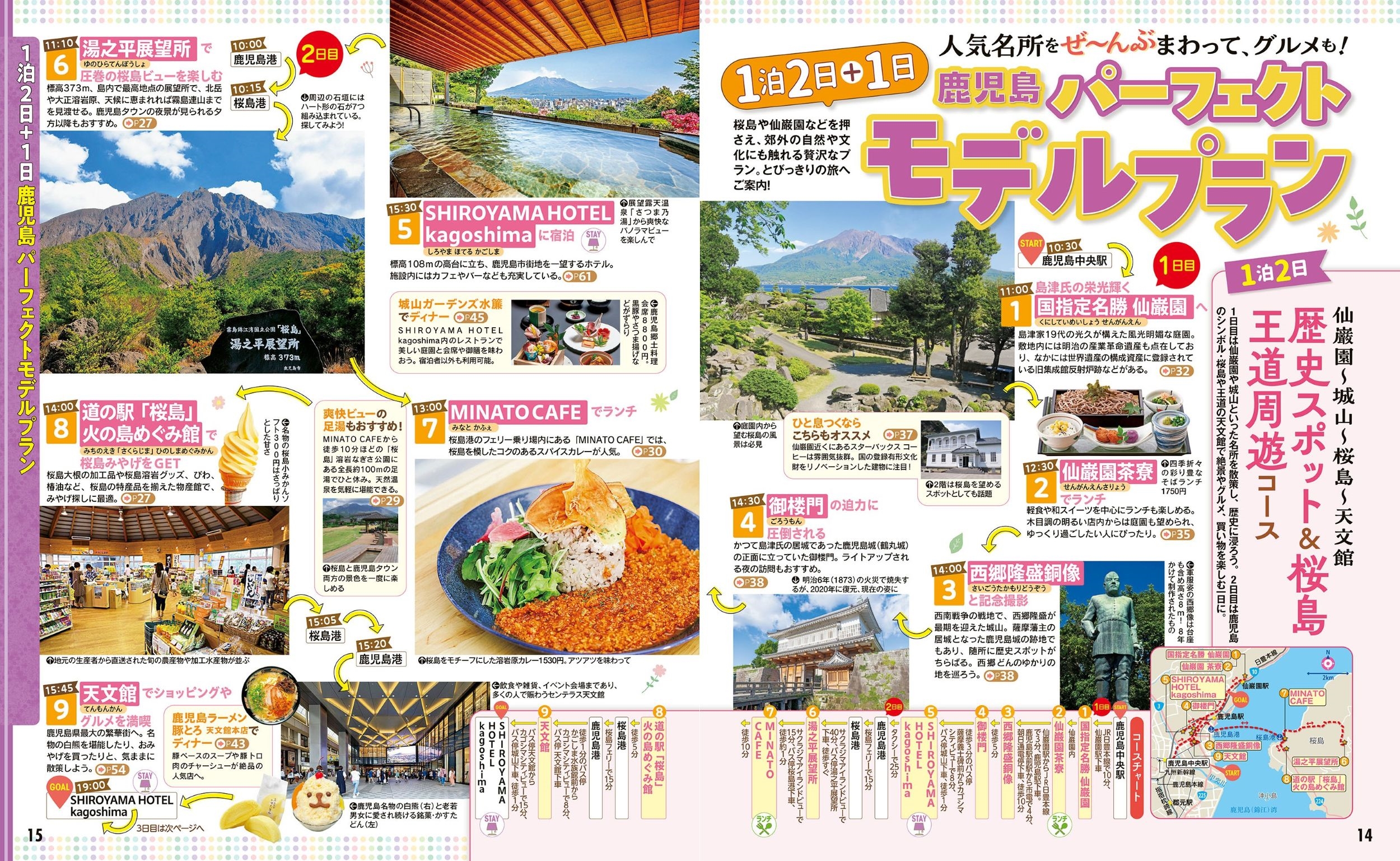 | ◎スマホやタブレットで使える便利な電子書籍付き ◎電子レジャーチケット「200円クーポン」でお得旅 ◎大きくて見やすいサイズ(通常版/25.7×21cm)と、持ち運びに便利な「超ちいサイズ」(18×14.7cm)の2つのサイズ展開!こちらは「超ちいサイズ」の商品ページです。 【鹿児島の魅力が詰まった一冊】 名勝仙巌園や城山、天文館など鹿児島タウンの必見スポットを網羅!鹿児島のシンボル・桜島や砂むしで知られる指宿、霧島神宮のほか、絶景スポットが集まる大隅半島など、魅力あふれる観光地の情報もギッシリ詰まった1冊です。 【巻頭特集1】 ・おすすめモデルプラン 【巻頭特集2】絶景 ・鹿児島の絶景をテーマに分けて紹介 【エリア特集】鹿児島タウン&桜島エリア ・桜島大特集 ・仙巌園特集 ・西郷どんゆかりの地特集 ・うんまか!鹿児島グルメ ・おみやげセレクション ・天文館&鹿児島中央駅 etc. 【エリア特集】指宿&知覧 ・砂むし温泉 ・指宿の温泉宿 ・開聞岳周辺 絶景&開運ドライブ ・知覧 武家屋敷群さんぽ ・知覧 カフェ&レストラン etc. 【エリア特集】霧島 ・霧島神宮参拝ガイド ・霧島神宮周辺ドライブ etc. 上記のほか、各エリアの名物グルメ、注目宿情報も満載です。 【掲載エリア】 鹿児島タウン・桜島、指宿・開聞岳・知覧、霧島、大隅半島、出水、薩摩川内、美山、串木野、枕崎 【特別付録】鹿児島ドライブMAP ※200円クーポンの利用期間は図書の販売終了まで ●「るるぶ」は、「みる」「食べる」「遊ぶ」を中心におすすめエリアやスポットを徹底紹介した旅行ガイドブックです。国内・海外あわせて約200のラインナップを展開、2023年でブランド誕生50周年を迎えました! 「るるぶ」の特徴はこちら ・写真が多くてわかりやすい! ・最新情報がたっぷり! ・見やすい地図もついてくる! 初めて訪れる方からリピーターまで、幅広い方々により旅行を楽しんでいただけるガイドブックです。 【特別付録】鹿児島ドライブMAP |