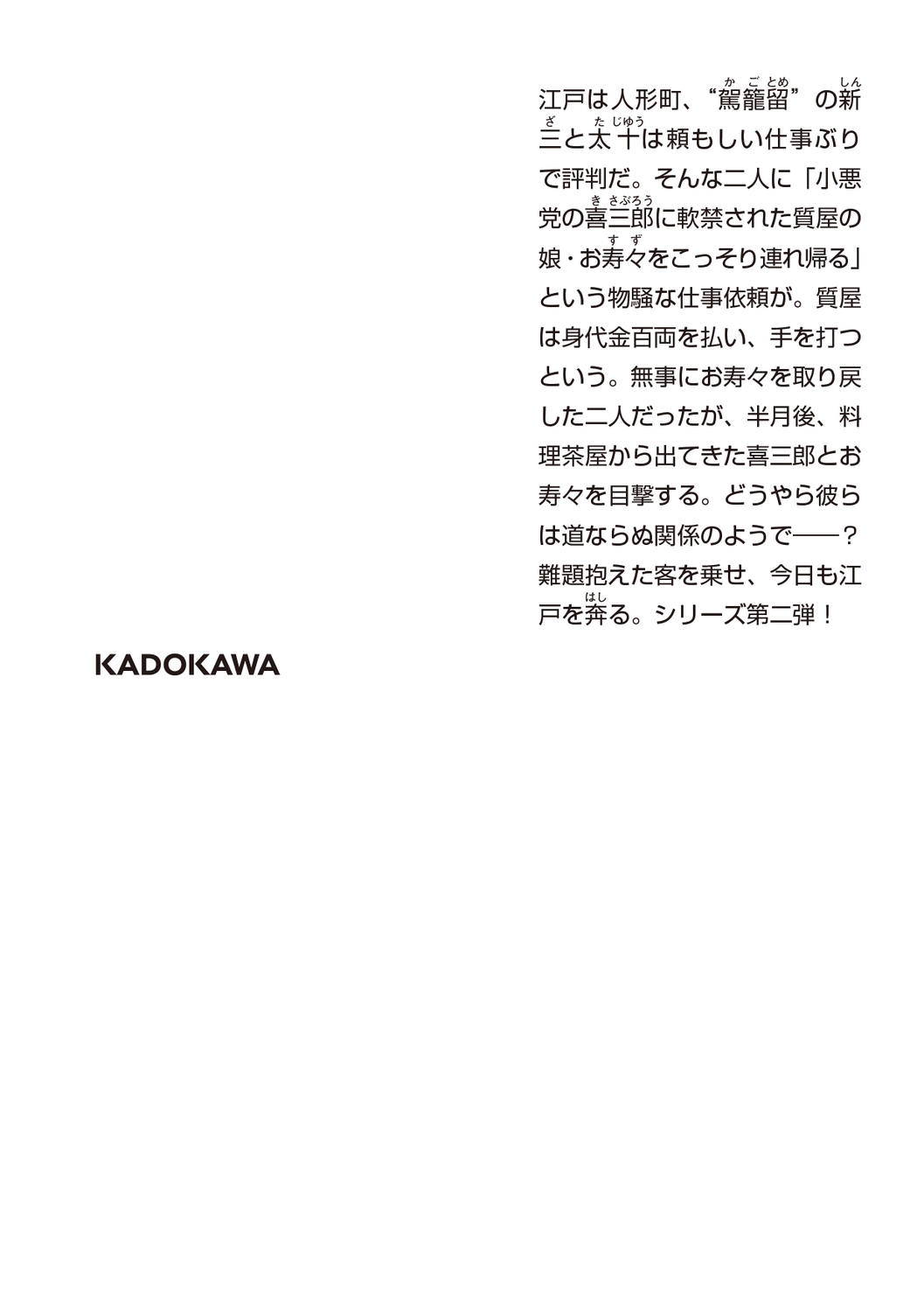 | 江戸は人形町、"駕籠留"の新三と太十は頼もしい仕事ぶりで評判だ。 そんな二人に「小悪党の喜三郎に軟禁された質屋の娘・お寿々をこっそり連れ帰る」という物騒な仕事依頼が。 質屋は身代金百両を払い、手を打つという。 御用聞きの長次郎の力も借り、無事にお寿々を取り戻した二人だったが、なんと数日後、茶屋から出てきた喜三郎とお寿々を目撃する。 彼らの道ならぬ関係を知ってしまった新三と太十は――? 難題抱えた客を乗せ、今日も江戸を奔る。人気シリーズ第二弾! |