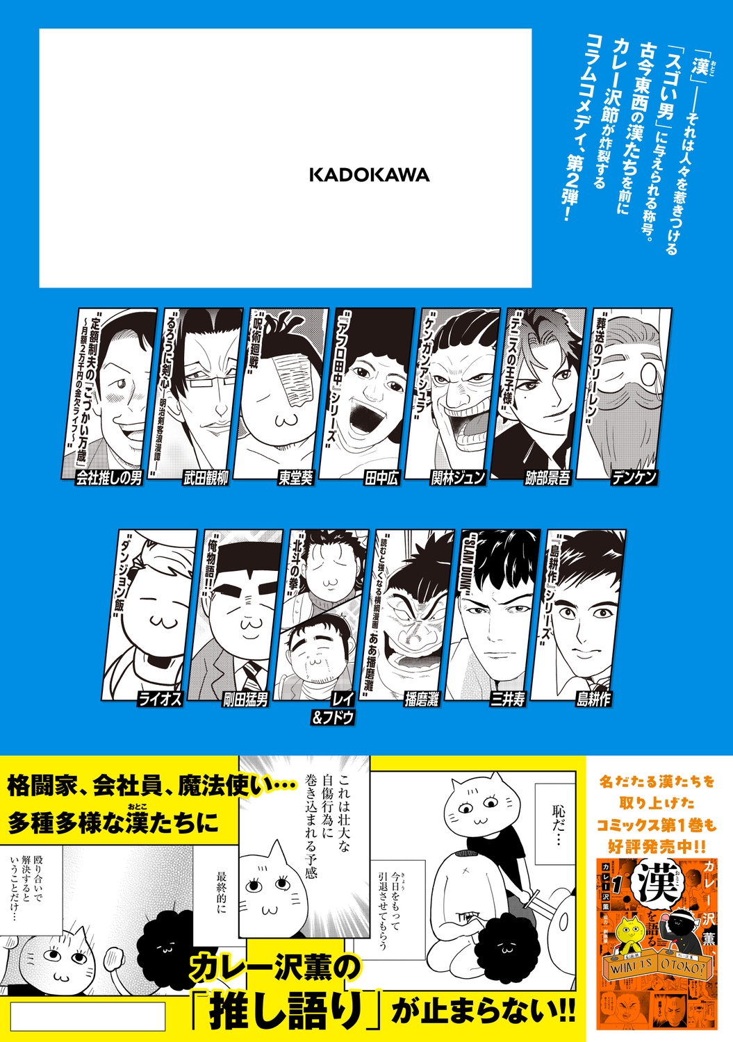 | 「#漢#おとこ#」――それは人々を惹きつける「スゴい男」に与えられる称号。 古今東西の漢たちを前にカレー沢節が炸裂するコラムコメディ、第2弾! |