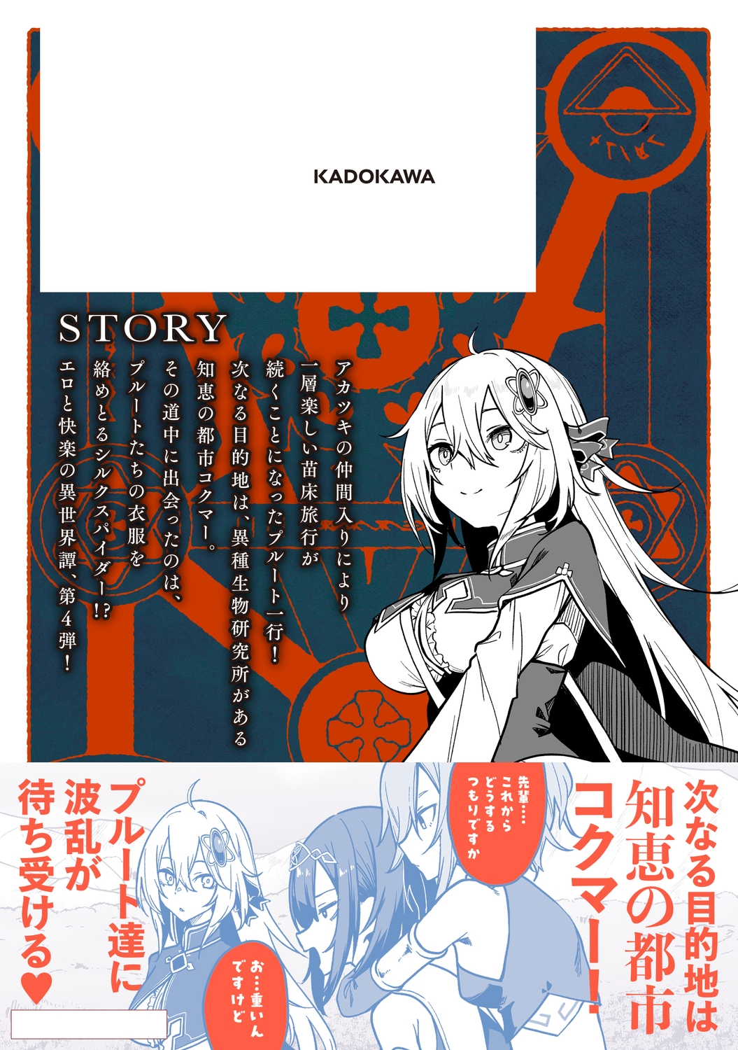 | アカツキの仲間入りにより、一層楽しい苗床旅行が続くことになったプルート一行。次の目的地は、異種生物研究所がある知恵の都市コクマー。その道中に出会ったのは、プルート達の衣服を絡めとるシルクスパイダー!? |