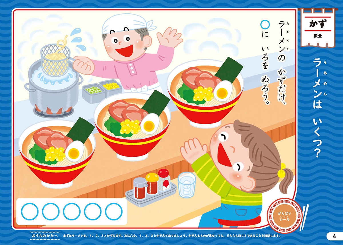 | ◆『ラーメンドリル』とは 子どもたちに大人気の食べ物、「ラーメン」がドリルに! ラーメンいっぱいの問題だから、楽しさマシマシ、やる気もアツアツ! 「ラーメン大好き」が「おべんきょうも大好き」になること、間違いなしです。 ◆こんな子におススメ ひらがな・数字に興味が出てきた子に ワークに初めて取り組む子に 麺類が好きな子に ◆内容 文字・数・ちえ・工作の4ジャンルをバランスよく収録。基礎力が身につきます! <文字>簡単なひらがな・言葉遊び *「めん」「のり」「みそ」など、思わず書きたくなる言葉がたくさん登場します。しりとりなどの言葉遊びも。 <数>1から10までの数 *ラーメンや炒飯の数をかぞえたり、比べたりしながら、算数の基礎を学びます。 <ちえ>迷路・間違いさがし・絵合わせパズル *一番大きいチャーシューはどれ? 一番長い麺は? などの問題で、観察力・思考力・集中力を養います。 <工作>…折る・切る・動かして遊ぶ *楽しいラーメン工作で、手指の巧緻性を育みます。 ★がんばりシール・おけいこシールつき ★ひらがな表つき ★何度も遊べるこうさくボードつき |