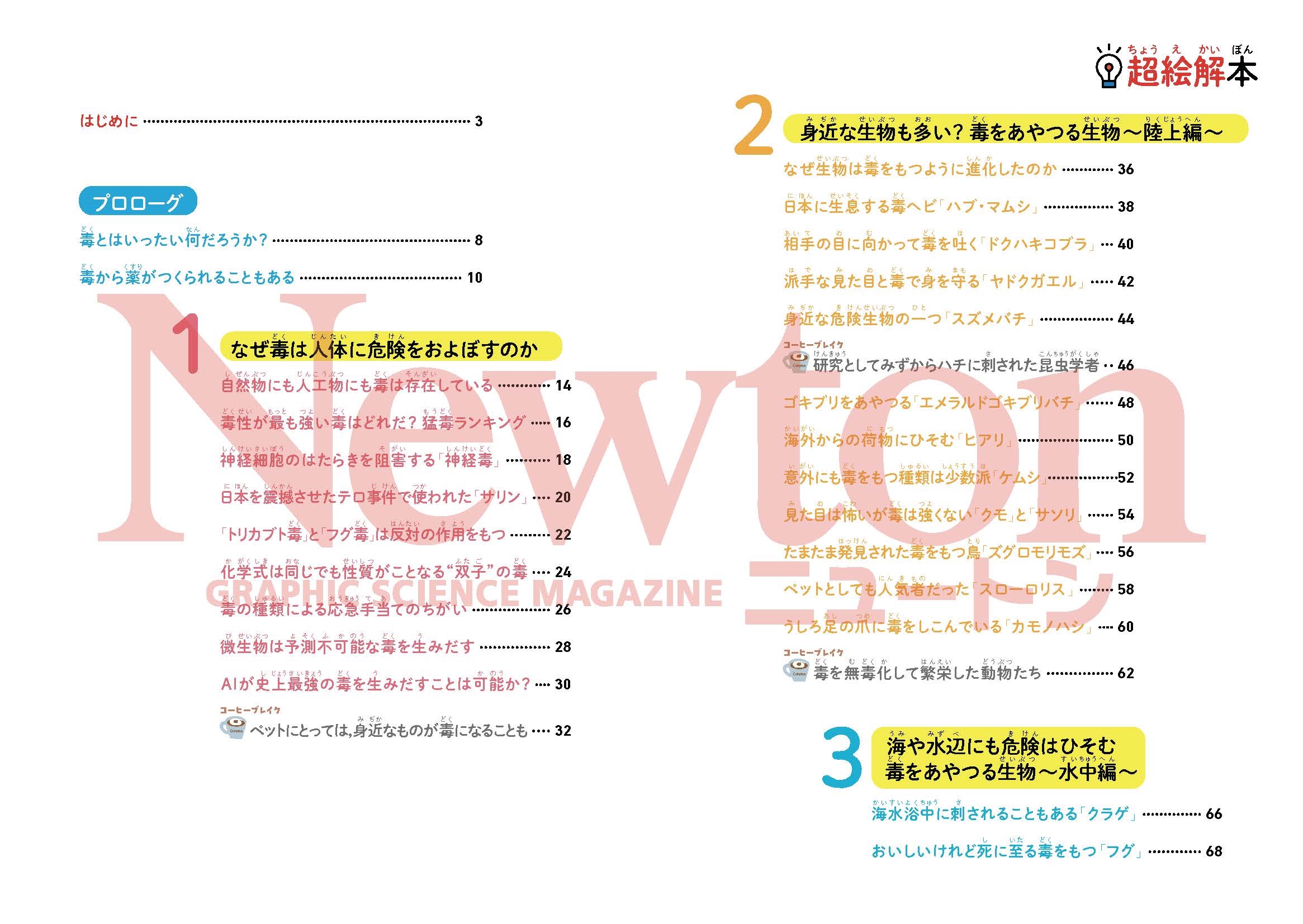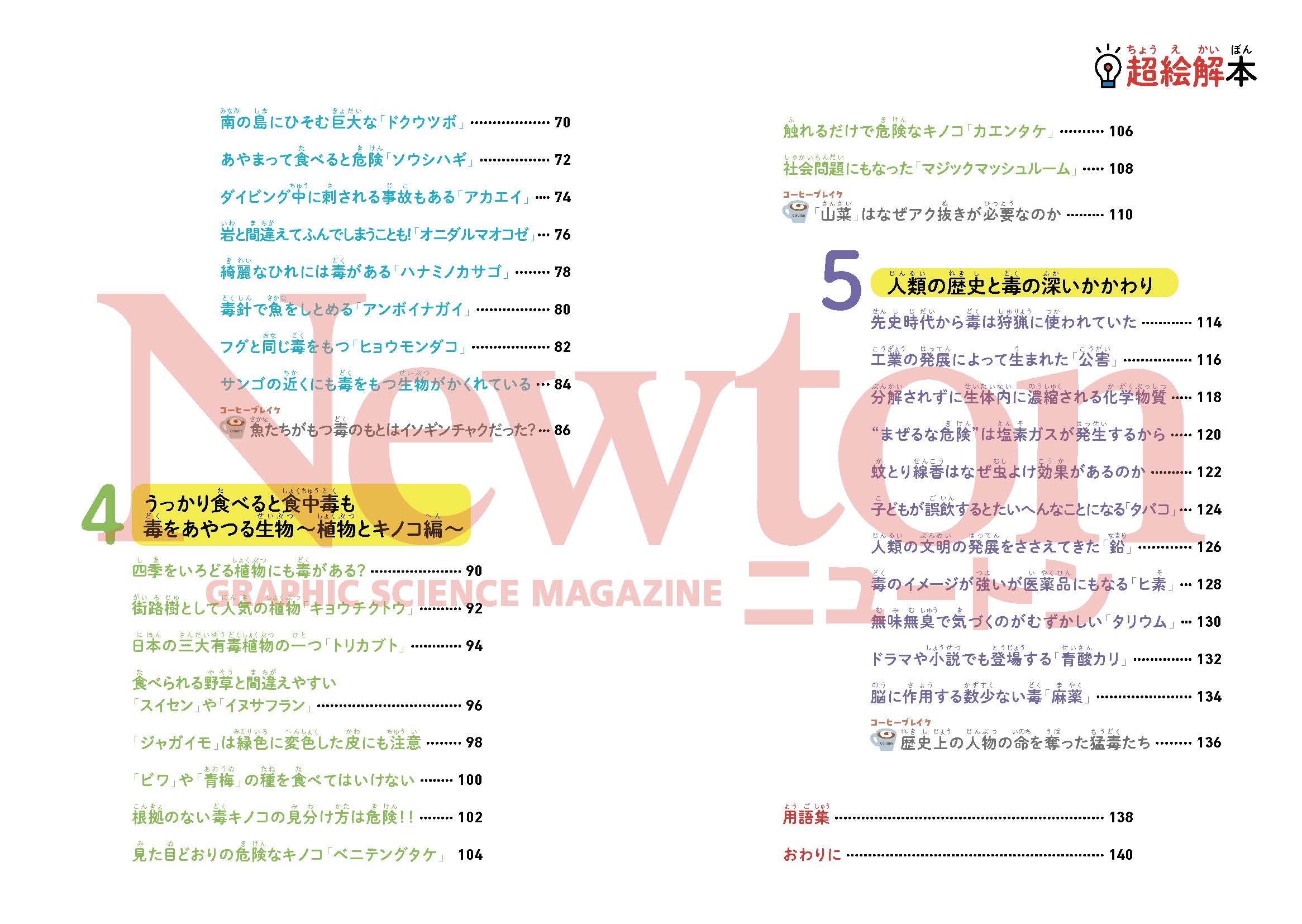 | 毒と聞いて何を思い浮かべますか。ヘビやクラゲのような,かまれたり刺されたりすると危険な生物でしょうか。あるいは,派手な見た目をした毒キノコでしょうか。それとも,映画や小説などで登場する毒物たちでしょうか。 毒をあやつる生物は,陸上,水や海辺など,あらゆるところにひそんでいます。昆虫や鳥類,哺乳類にも,毒をもつ生物はいます。歩道や公園で見かける街路樹やキノコに毒がある場合もあります。 この本では,なぜ毒がヒトに害をおよぼすのか。どのように気をつけたらよいのかといった基本的な知識はもちろん,毒をもつさまざまな危険生物や,人類が生みだした毒など数多く紹介しています。おそろしくも奥深い,毒の世界をみていきましょう。 |
