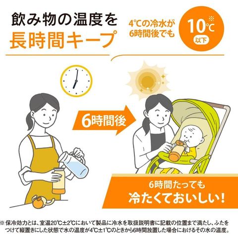 ※保冷効力とは、室温20℃±2℃において製品に冷水を取扱説明書に記載の位置まで満たし、ふたをつけて縦置きにした状態で水の温度が4℃±1℃の時から6時間放置した場合におけるその水の温度