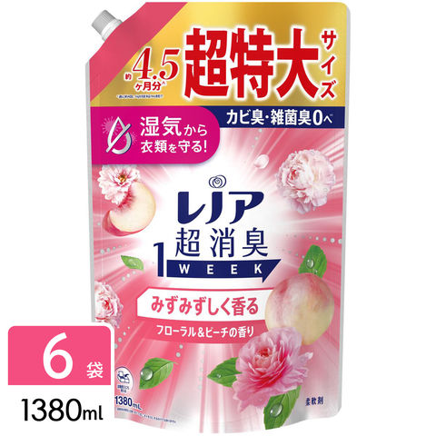 P&G レノア 超消臭1WEEK 柔軟剤 みずみずしく香るフローラル&ピーチの香り 詰め替え 超特大 1380mL×6袋 4987176312693