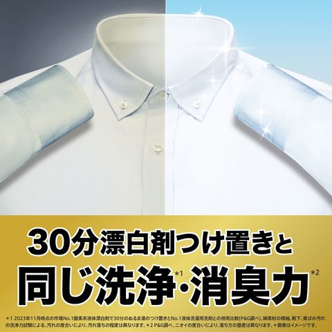 *2023年11月時点の市場No.1酸素系液体漂白剤で30分のぬるま湯のつけ置きとNo.1液体洗濯用洗剤との併用比較(P&G調べ)。綿素材の襟袖、靴下、黄ばみ汚れの洗浄力試験による。汚れの度合いにより、汚れ落ちの程度は異なります。