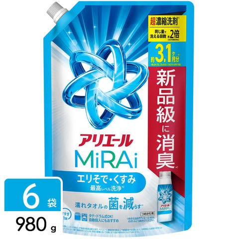 P&G アリエールミライ 洗濯洗剤 MiRAi 超濃縮コンパクト洗剤 エリそで・くすみ最高レベル洗浄 詰め替え ウルトラジャンボ 980g×6袋 4987176318848