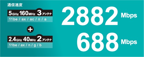 5GHzにおいて最大2882Mbps、2.4GHzにおいて最大688Mbpsの高速通信が可能です。