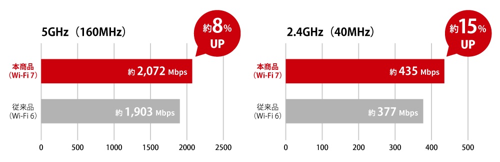 本商品は、Wi-Fi 7に対応した、5GHz/2.4GHz 2つの周波数帯での通信を実現するスタンダードモデルです。