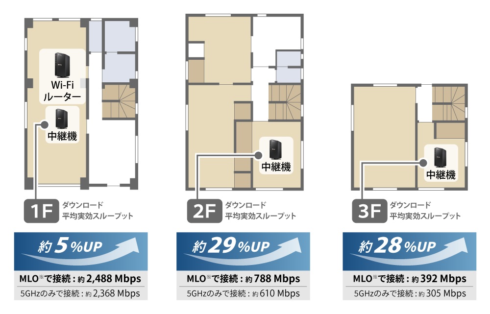 本商品同士をWi-Fi 7で接続して、MLO(2バンド同時モード 5GHz + 2.4GHz)を使用した場合と5GHzだけを使用した場合のPCの通信速度を比較すると、特に2Fと3FのWi-Fiルーターから遠い箇所でMLOを使用した場合の速度が大きく向上しました。