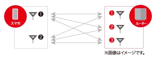 本商品は5GHz用に3本のアンテナを搭載。遠距離の2アンテナ通信をより高速・安定化させるために機能します。