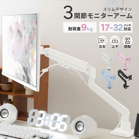3関節のガススプリング式アームにより、動画鑑賞や事務作業、ゲームなど様々な用途に合わせながら、自由自在にモニターの角度や高さを調整できます