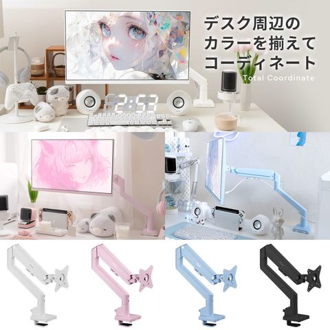 3関節のガススプリング式アームにより、動画鑑賞や事務作業、ゲームなど様々な用途に合わせながら、自由自在にモニターの角度や高さを調整できます