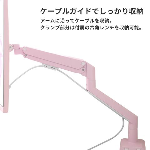 アームに沿ってケーブルを収納。 クランプ部分は付属の六角レンチを収納可能。