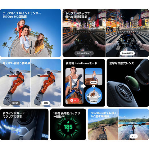 驚異的な8K360度動画、強化された低照度性能、交換式レンズ、3時間のバッテリー寿命、さらに直感的に操作できる新しいモードとアップデートしたアプリにより、創造性を簡単に発揮できます。