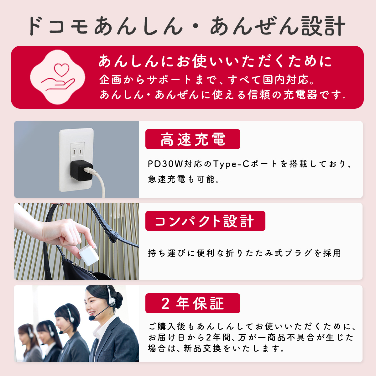 ドコモ純正 ポータブルACアダプタ04M ブラック 最大30W Type C ポート 急速充電 たためるプラグ 軽量 異常検知機能 2年保証 iPhone Android
