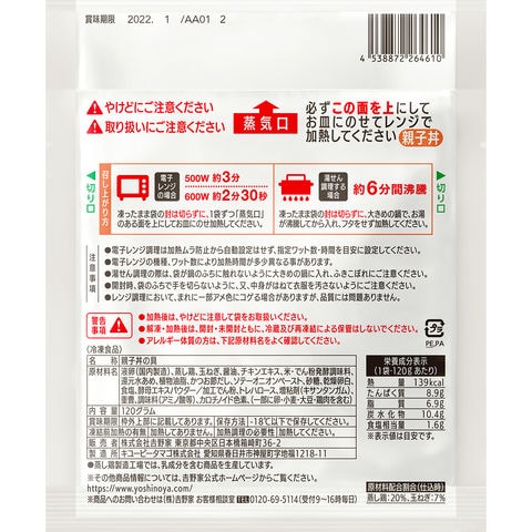 親子丼の具:鶏卵(国産)、鶏肉(タイ他)、玉ねぎ(中国産)