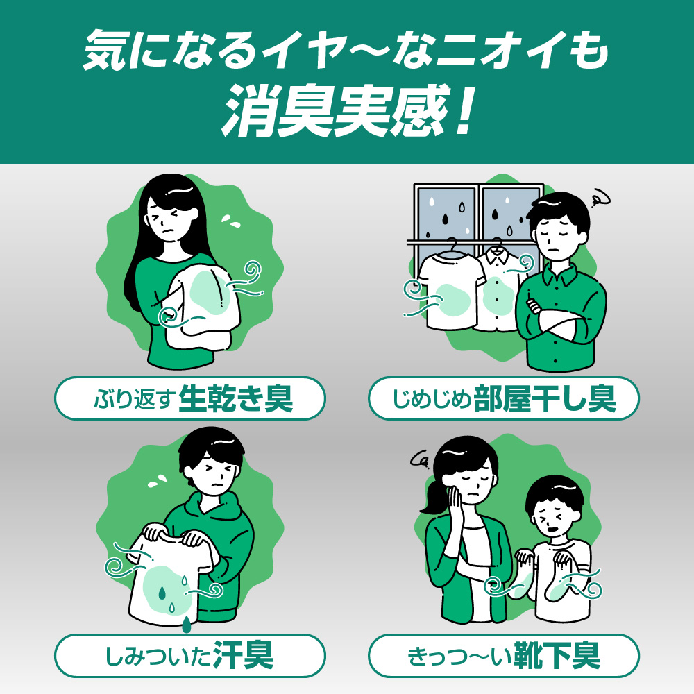 生乾き臭・部屋干し臭・汗臭・靴下臭どーんなニオイもニオってない!●ハミング内No.1抗菌※※1抗菌できる菌が複数あること。一部の菌は数回の洗たく。※2すべての菌の増殖を抑えるわけではありません。●アタックの消臭技術採用●ニオイ戻りもブロック(着用中の汗臭、濡れ戻り臭)●洗たく槽も防カビ(すべてのカビの増殖を抑えるわけではありません)●花粉ブロック(静電気を防ぐ)●リフレッシュグリーンの香り