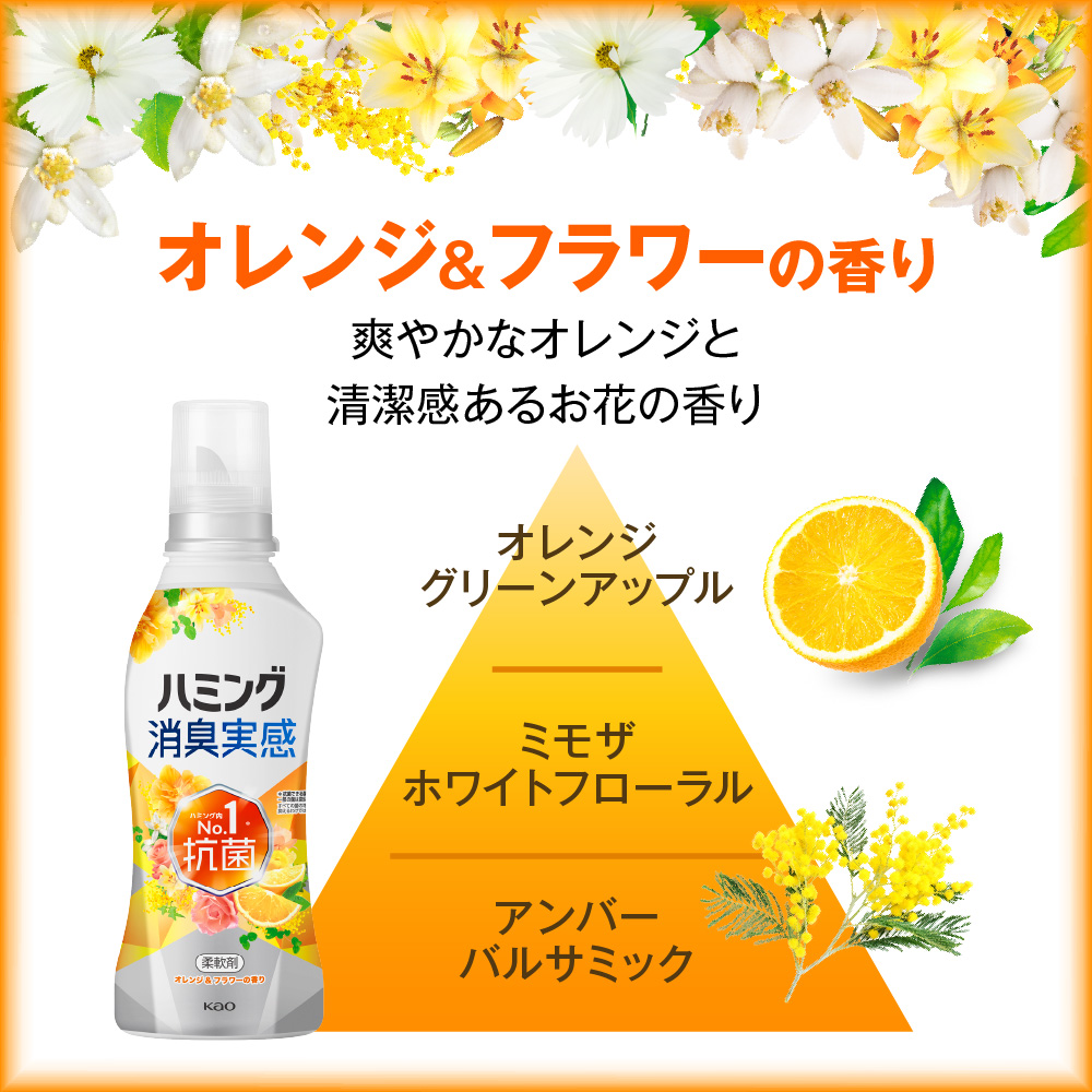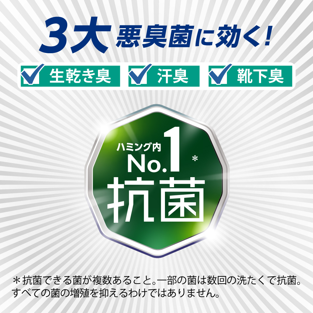 生乾き臭・部屋干し臭・汗臭・靴下臭どーんなニオイもニオってない!●ハミング内No.1抗菌※※1抗菌できる菌が複数あること。一部の菌は数回の洗たく。※2すべての菌の増殖を抑えるわけではありません。●アタックの消臭技術採用●ニオイ戻りもブロック(着用中の汗臭、濡れ戻り臭)●洗たく槽も防カビ(すべてのカビの増殖を抑えるわけではありません)●花粉ブロック(静電気を防ぐ)●オレンジ&フラワーの香り