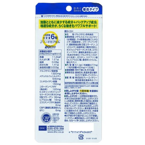 ■栄養成分表示/[6粒2862mgあたり]熱量11.2kcal、たんぱく質1.21g、脂質0.08g、炭水化物1.41g、食塩相当量0.033g、グルコサミン塩酸塩1320mg、メチルスルフォニルメタン540mg、コンドロイチン硫酸150mg、コラーゲンペプチド(魚由来)120mg、5-ロキシン(ボスウェリアセラータエキス末)60mg、II型コラーゲン36mg、ヒアルロン酸18mg、エラスチンペプチド(魚由来)6mg、CBP(濃縮乳清活性たんぱく)6mg