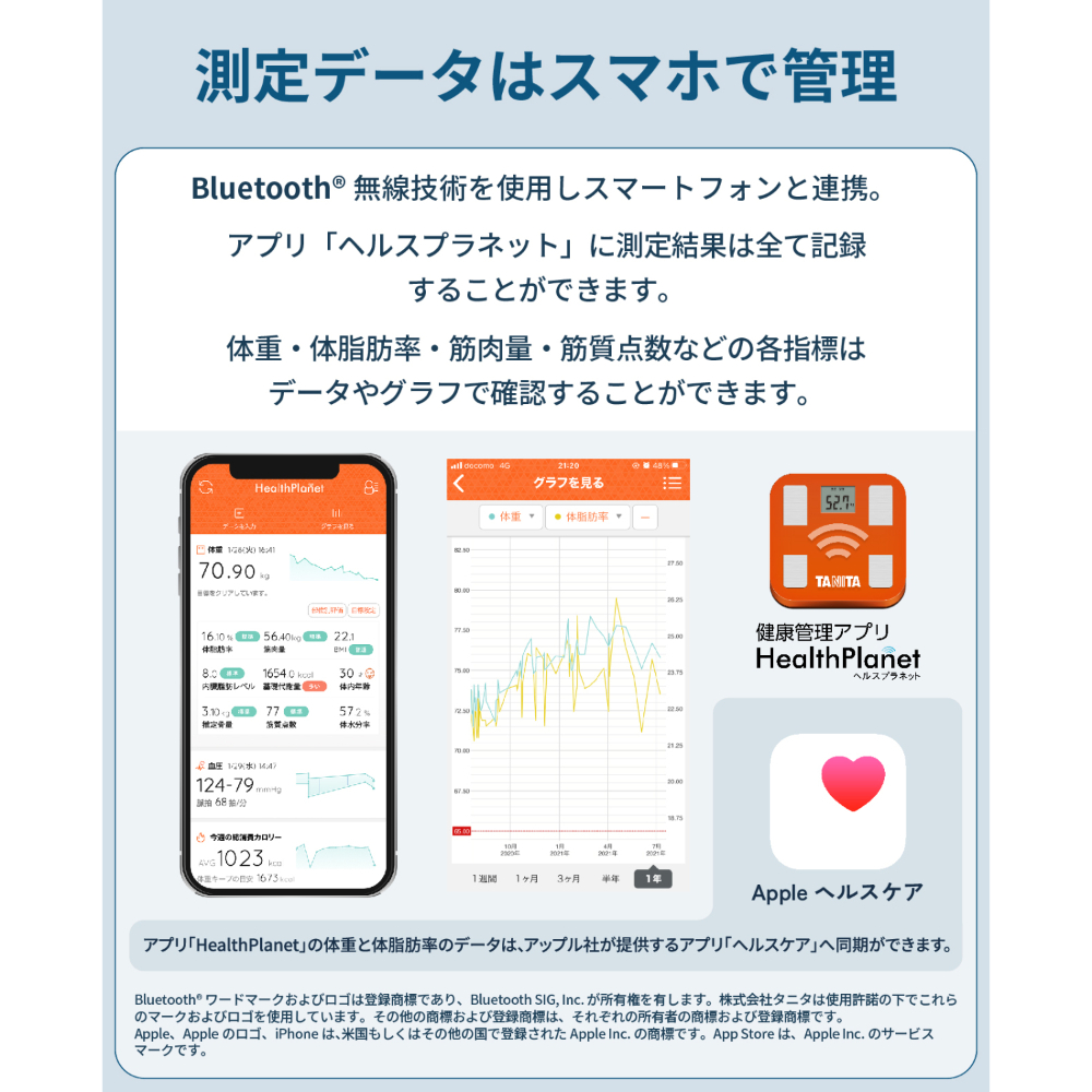 Bluetooth通信に対応し、対応のiPhone・Android端末にデータを転送。アプリでデータ管理ができます。