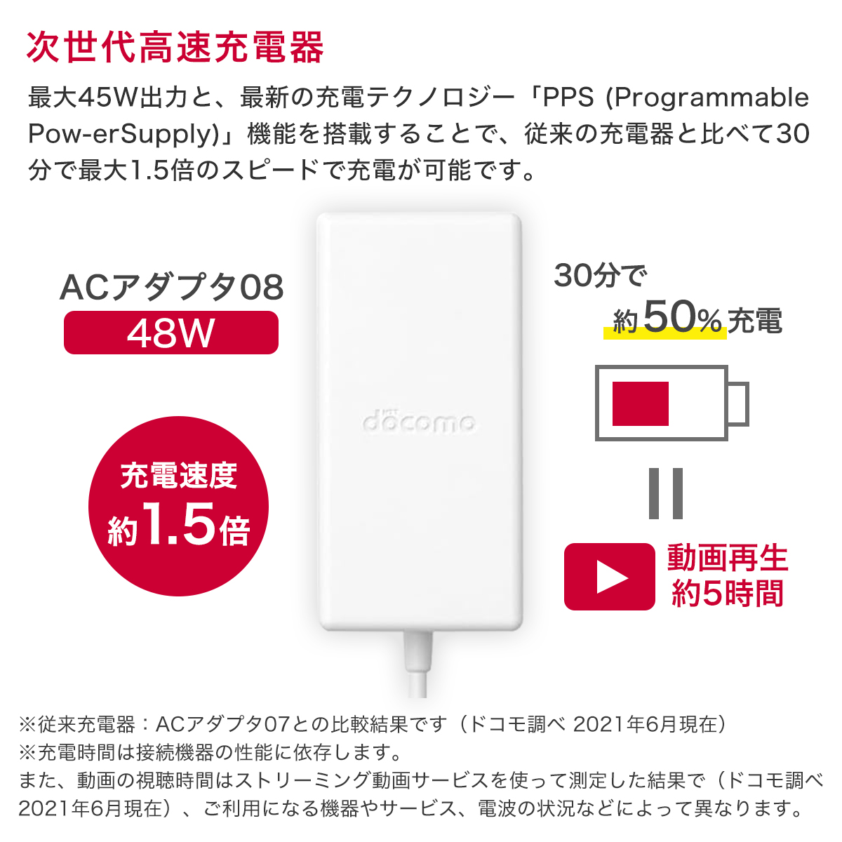 ACアダプタ 08でわずか30分充電するだけで、約5時間の動画視聴が可能で、スマホの充電切れによるストレスや待ち時間の不満を解消してくれます。