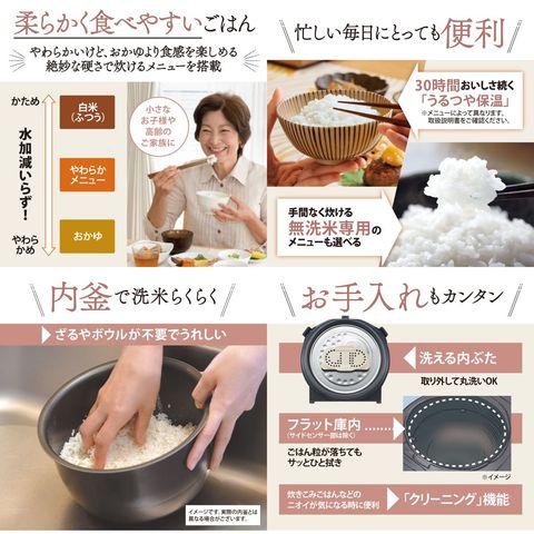 「白米ふつう」で炊いたごはんが硬すぎて、おいしく食べられない方でも食感が楽しめる「やわらかごはん」メニューです。「白米ふつう」よりやわらかく、「おかゆ」よりかために炊けます。