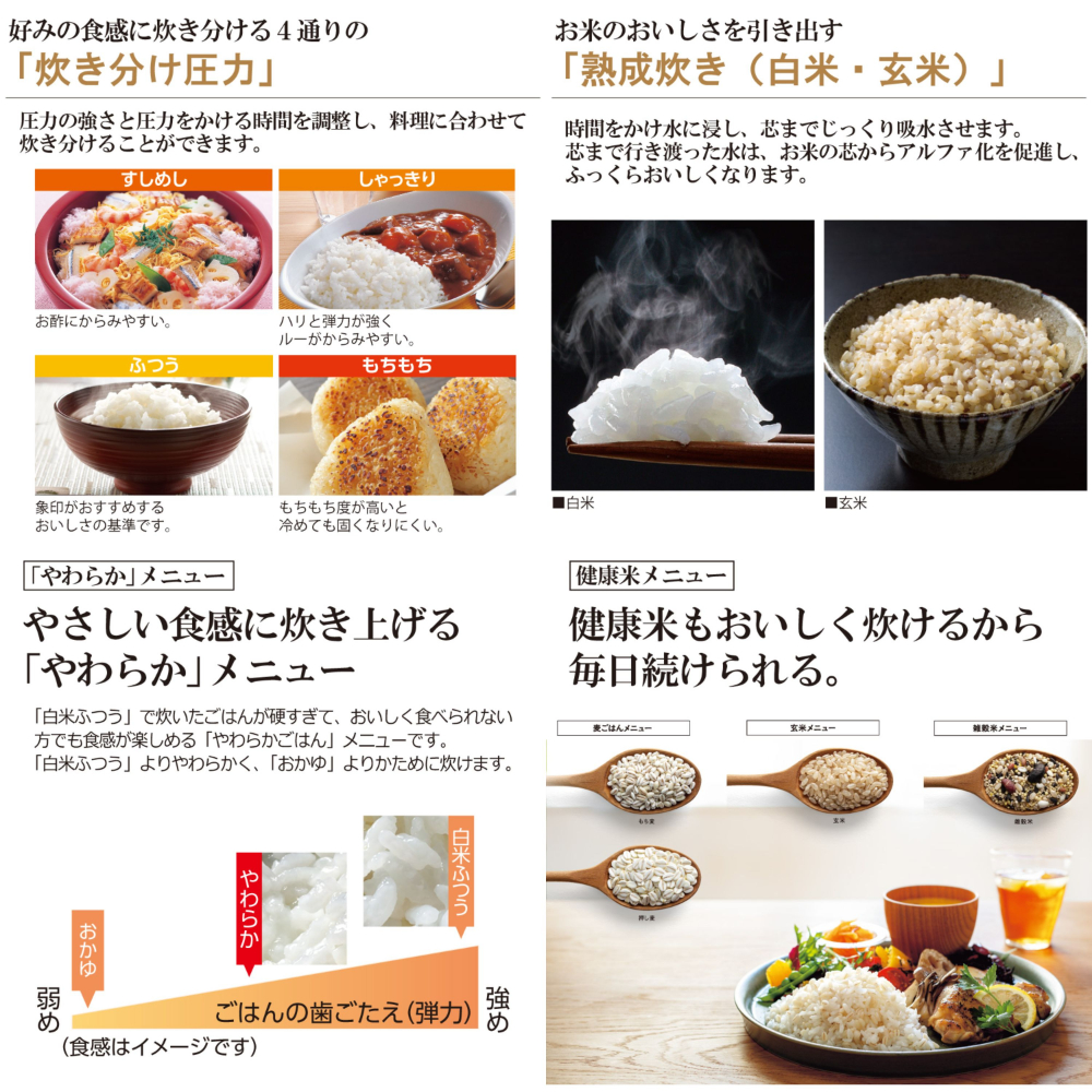 圧力の強さと圧力をかける時間を調整して、すしめし、白米しゃっきりからもちもちまでメニューにあわせて4通りの食感に炊き分けます。好みの食感に合わせて炊いていただけます。