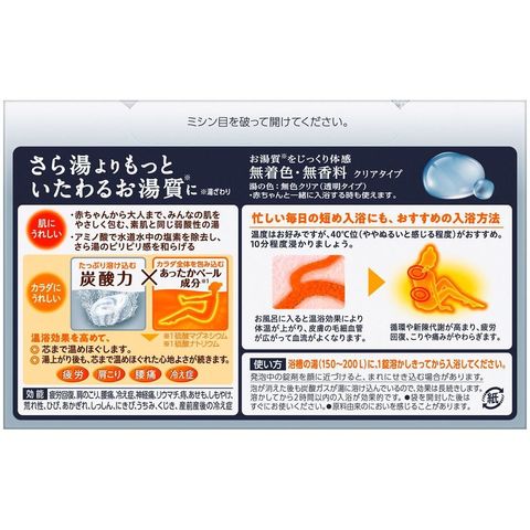 さら湯よりもっといたわるお湯質※に。塩素除去剤(アミノ酸)配合で、さら湯のピリピリ感を和らげる。赤ちゃんから大人まで皆の肌をやさしく包む素肌と同じ弱酸性の湯。「炭酸力」と「あったかベール成分」で温浴効果を高めて芯まで温めほぐす!疲労・肩こり・腰痛・冷え症に。お湯質をじっくり体感できる無着色・無香料のクリアタイプ。赤ちゃんと一緒に入浴する時も使えます。無色の湯(透明タイプ)【医薬部外品】※湯ざわり
