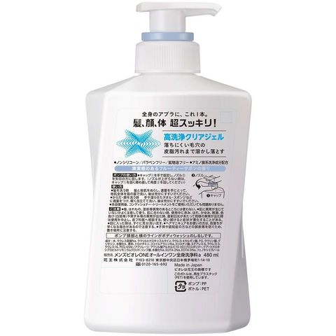 髪、顔、体、全てを洗えるメンズビオレONEオールインワン全身洗浄料!独自開発の「高洗浄クリアジェル」で髪、体はもちろん、頭皮も含めた、落ちにくい毛穴の皮脂・汗汚れまで溶かし出して、洗い落します。1本で全身のアブラ超スッキリ!髪の毛も無理なく洗えます。ノンシリコーン。ノンメントール。パラベンフリー。鉱物油フリー。アミノ酸系成分配合(洗浄成分)。清潔感のあるフルーティーサボンの香り。