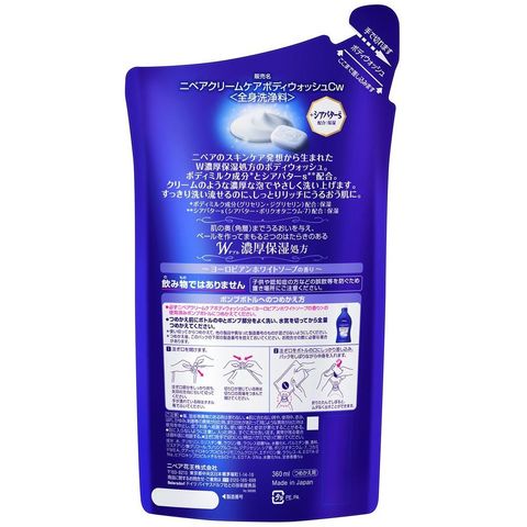 ニベアのスキンケア発想から生まれたW濃厚保湿※処方のボディウォッシュ。ボディミルク成分*とシアバターs**配合。クリームのような濃厚な泡でやさしく洗い上げます。すっきり洗い流せるのに、しっとりリッチにうるおう肌に。ヨーロピアンホワイトソープの香り。*ボディミルク成分(グリセリン・ジグリセリン)配合:保湿**シアバターs(シアバター・ポリクオタニウム-7)配合:保湿 ※うるおいを与えて、まもる