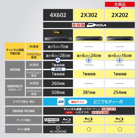 ※1 【2X602】10チャンネルのうち、BS・110度CSは最大5チャンネルまで選択可能。【2X302】6チャンネルのうち、BS・110度CSは最大5チャンネルまで選択可能。【2X202】6チャンネルのうち、BS・110度CSは最大2チャンネルまで選択可能。録画日数は15倍録モードの場合。自動メンテナンス中はチャンネル録画や再生、ダビングなどの一部の機能が使えません。(毎日5分程度)チャンネル録画用のハードディスク容量がいっぱいになると、古い番組から自動で上書き消去します。