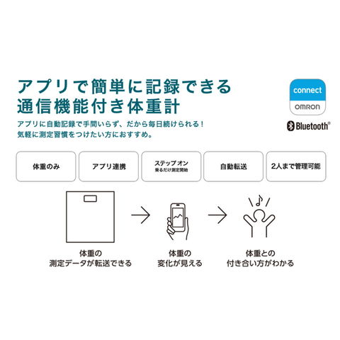 Bluetooth通信機能を搭載。iPhone/Androidスマートフォン用のアプリ「OMRON connect(オムロンコネクト)」に測定データが転送され、結果が記録されます。アプリに登録された身長から自動的にBMI※を計算し、アプリ内で確認できます。
